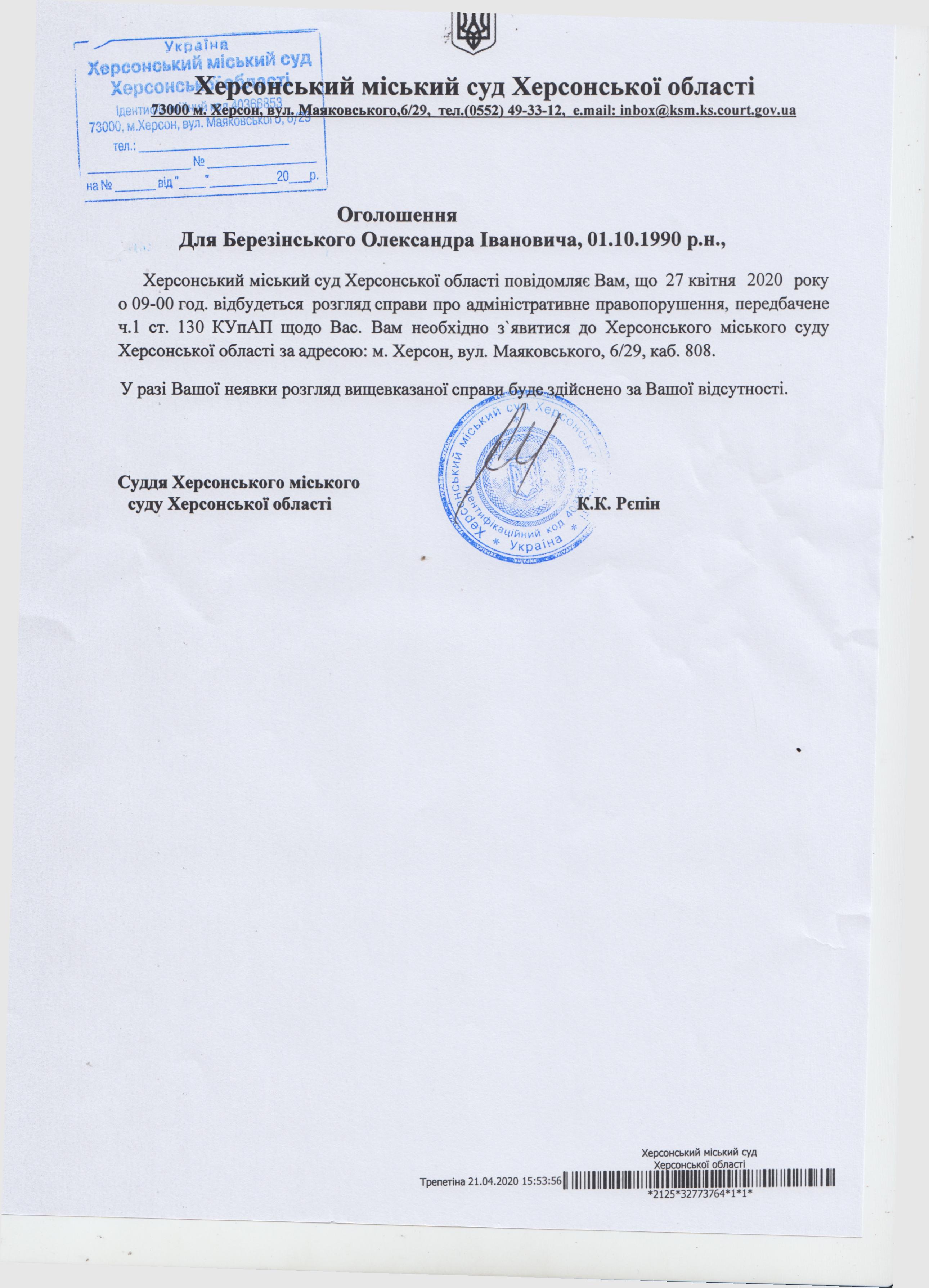 ОГОЛОШЕННЯ для Березінського Олександра Івановича
