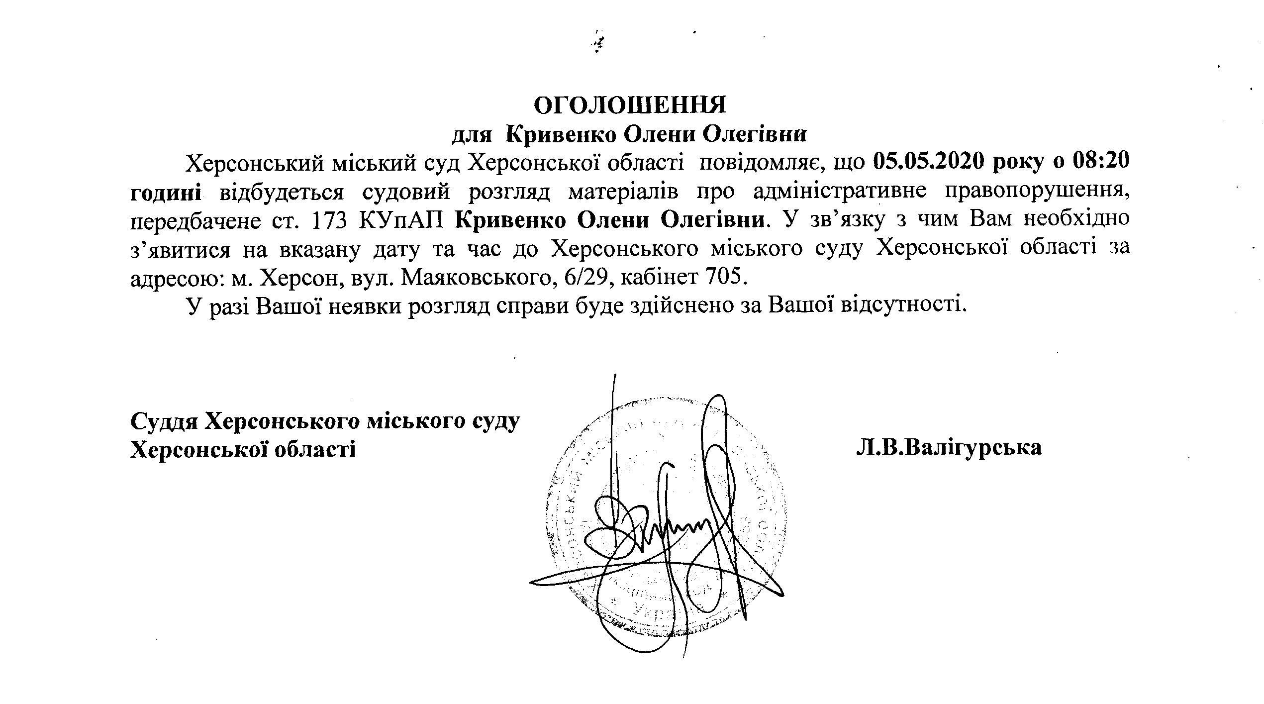 ОГОЛОШЕННЯ для Кривенко Олени Олегівни