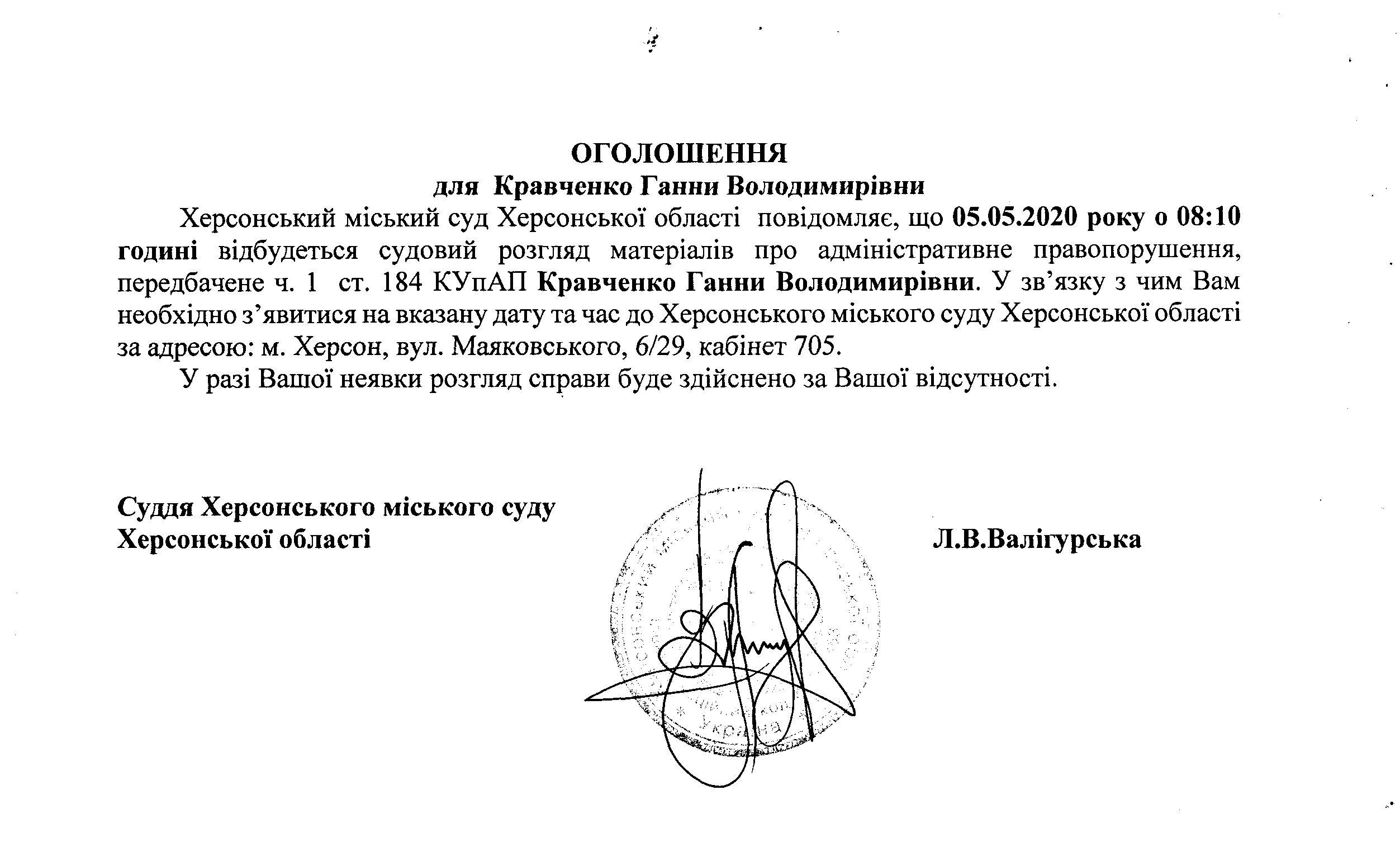ОГОЛОШЕННЯ для Кравченко Ганни Володимирівни