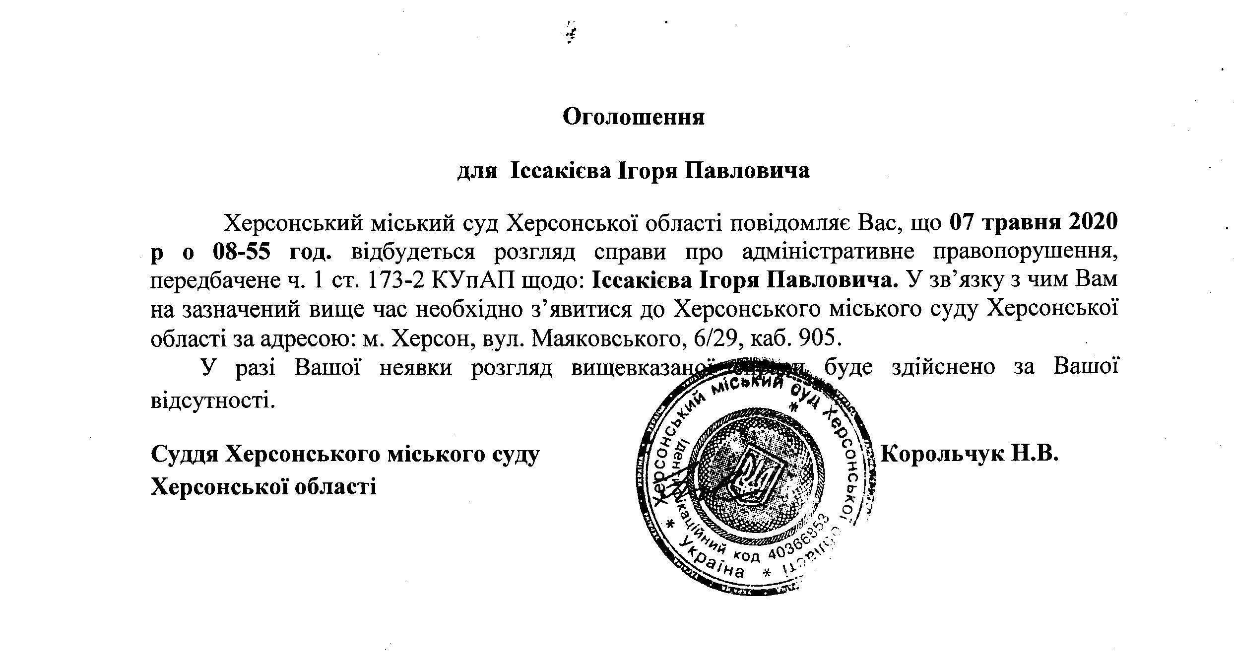 ОГОЛОШЕННЯ для Іссакієва Ігоря Павловича