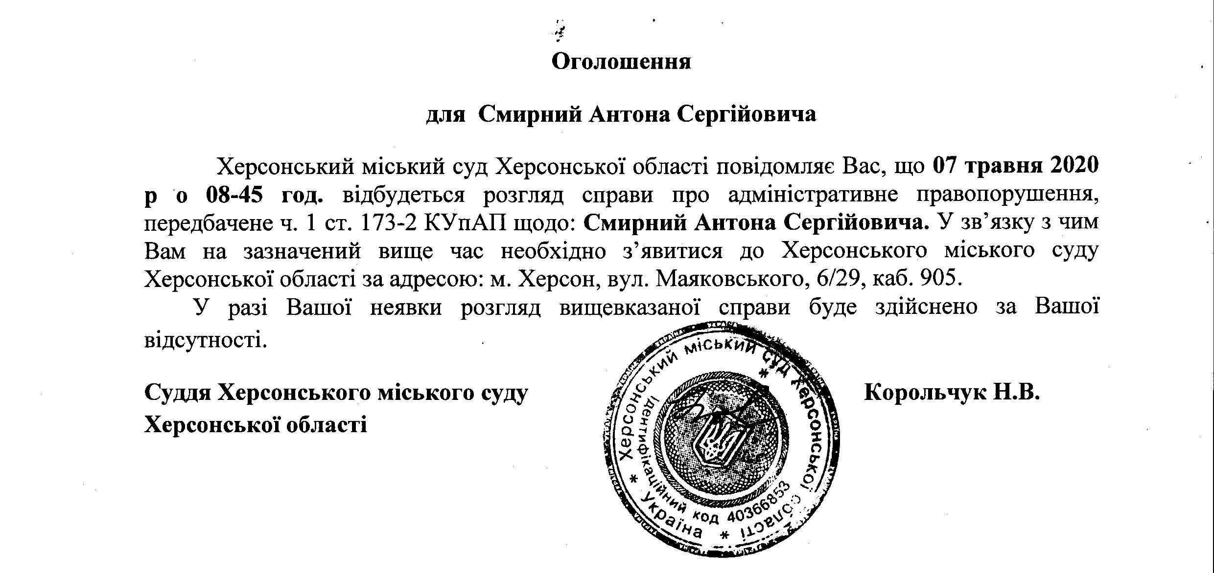 ОГОЛОШЕННЯ ПРО ВИКЛИК ДО СУДУ