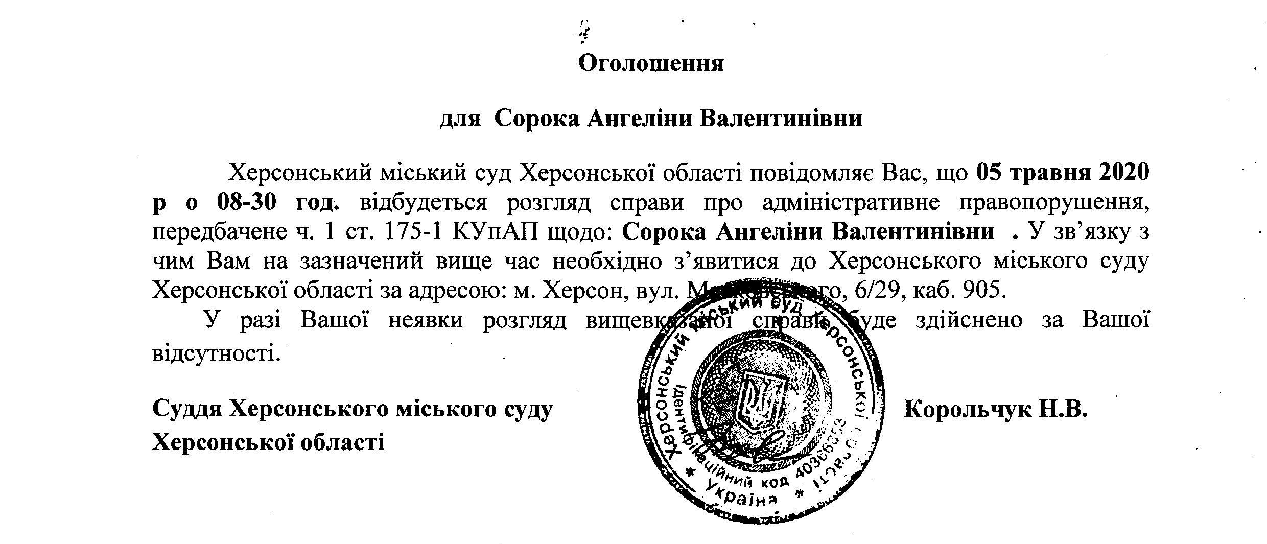 ОГОЛОШЕННЯ для Сороки Ангеліни Валентинівни