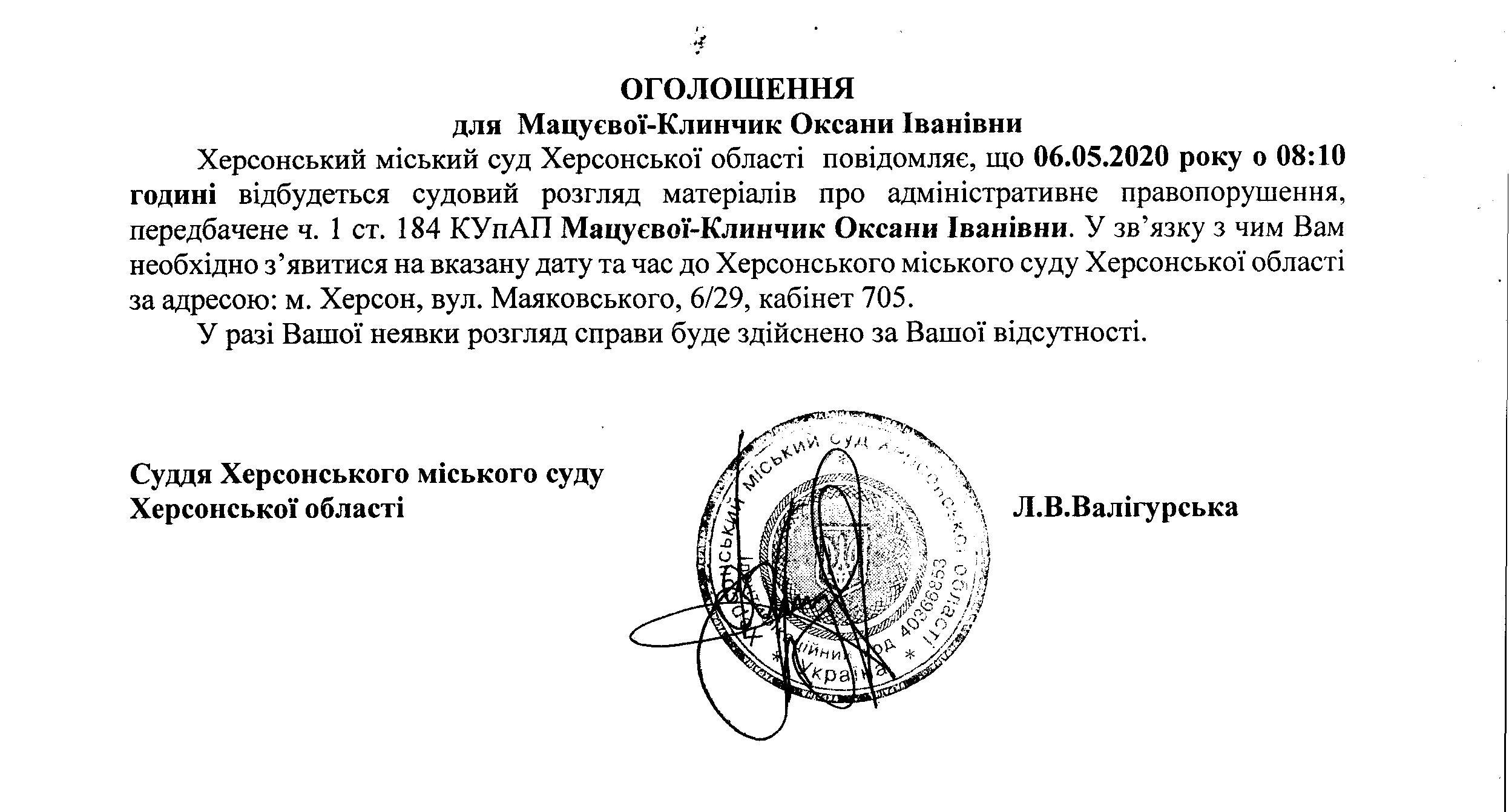 ОГОЛОШЕННЯ для Мацуєвої - Клинчик Оксани Іванівни