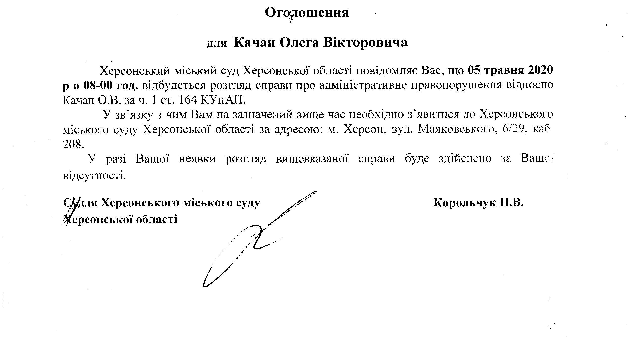 ОГОЛОШЕННЯ для Качан Олега Вікторовича