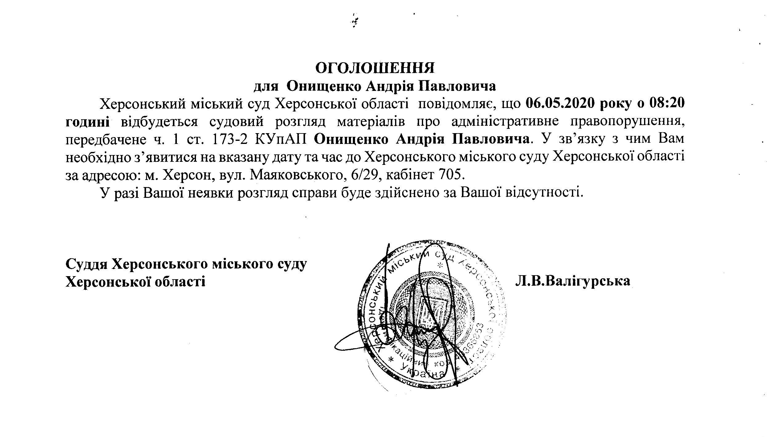 ОГОЛОШЕННЯ для Онищенко Андрія Павловича