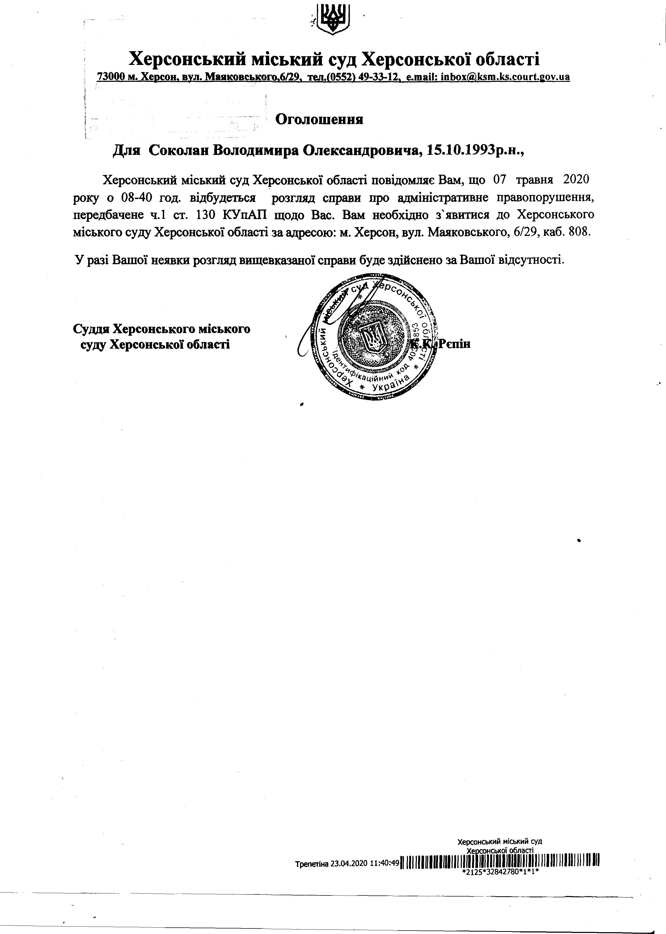 ОГОЛОШЕННЯ для Соколан Володимира Олександровича