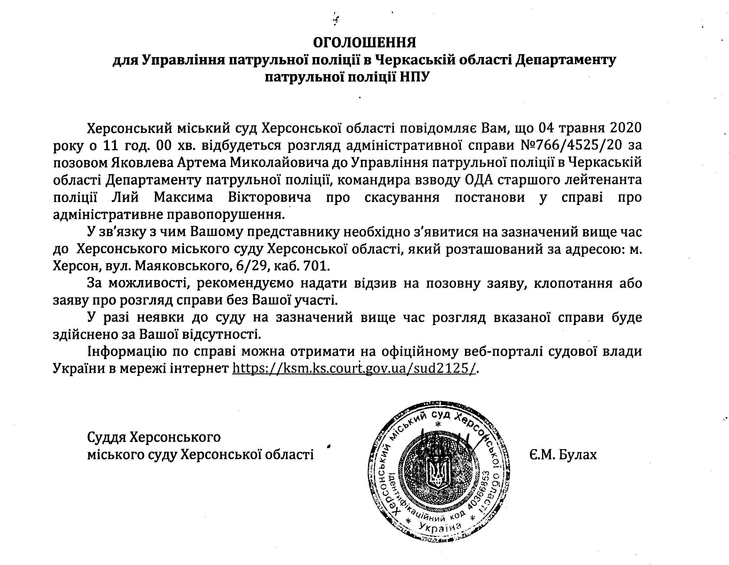 ОГОЛОШЕННЯ ПРО ВИКЛИК ДО СУДУ