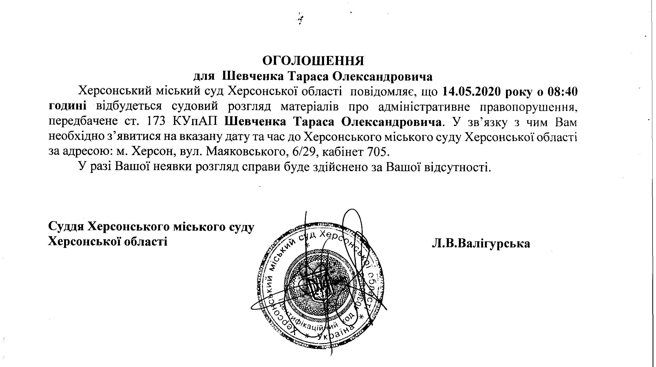 ОГОЛОШЕННЯ ПРО ВИКЛИК ДО СУДУ