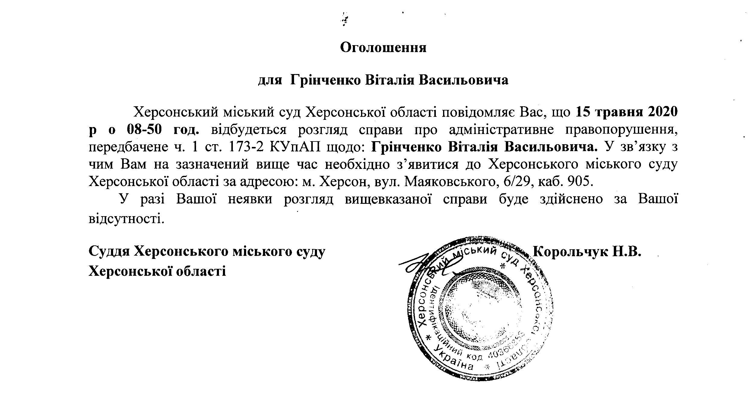 ОГОЛОШЕННЯ для Грінченко Віталія Васильовича