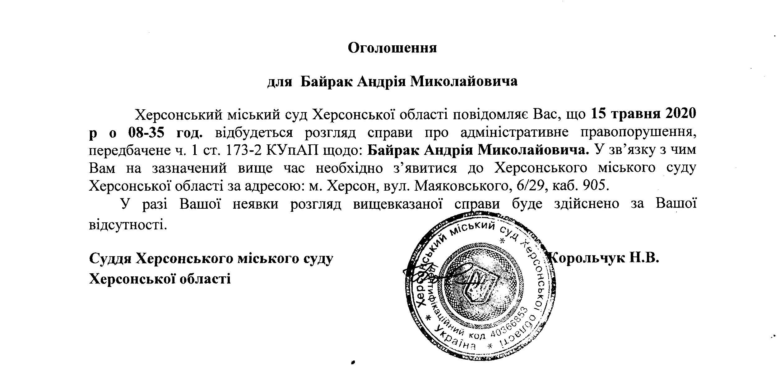 ОГОЛОШЕННЯ для Байрак Андрія Миколайовича