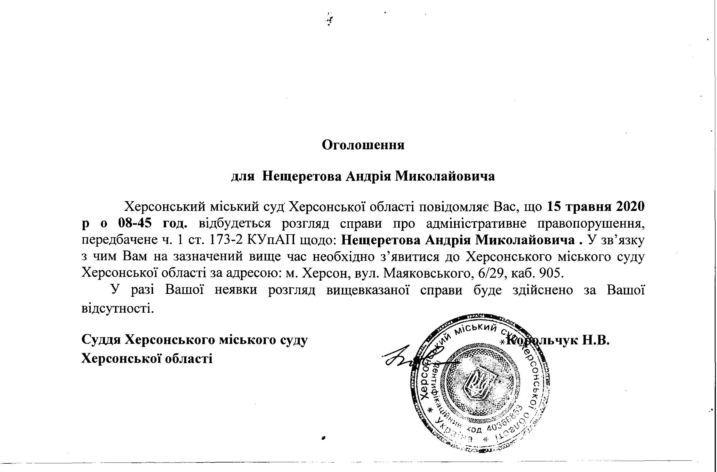 ОГОЛОШЕННЯ для Нещеретова Андрія Миколайовича