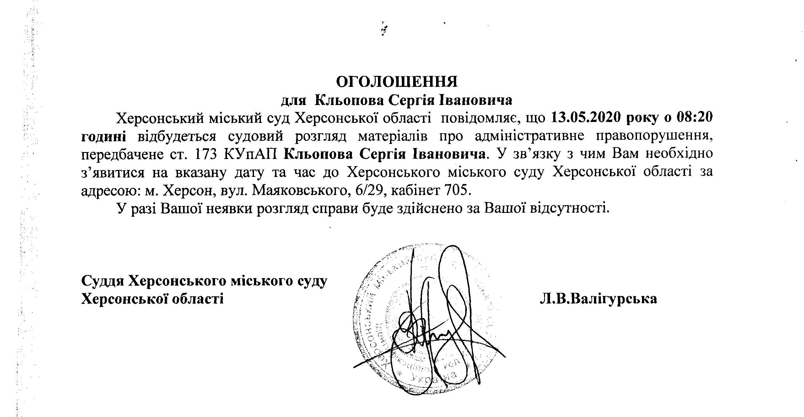 ОГОЛОШЕННЯ для Кльопова Сергія Івановича