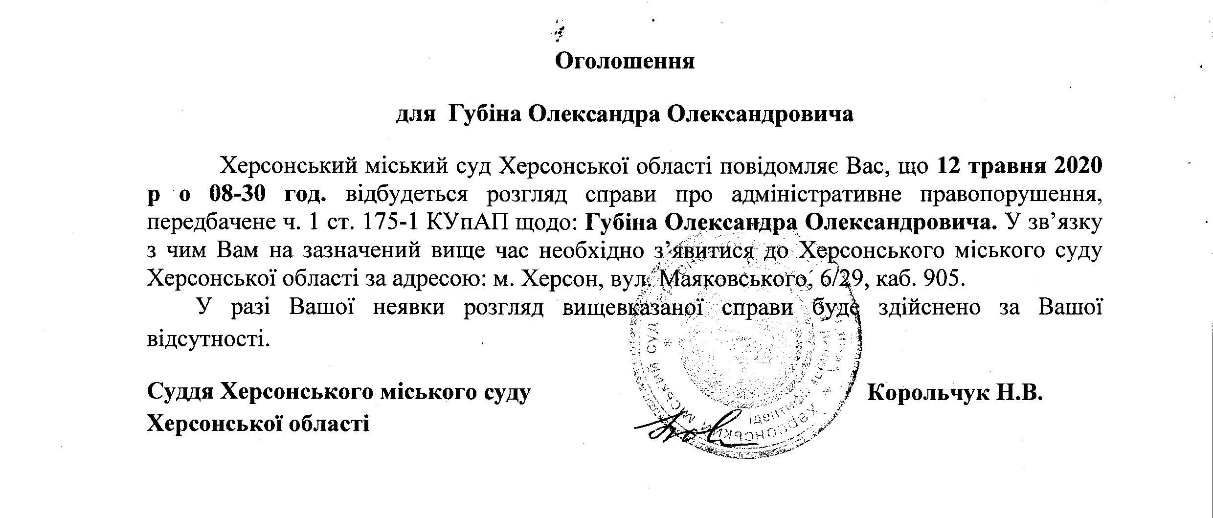 ОГОЛОШЕННЯ для Губіна Олександра Олександровича