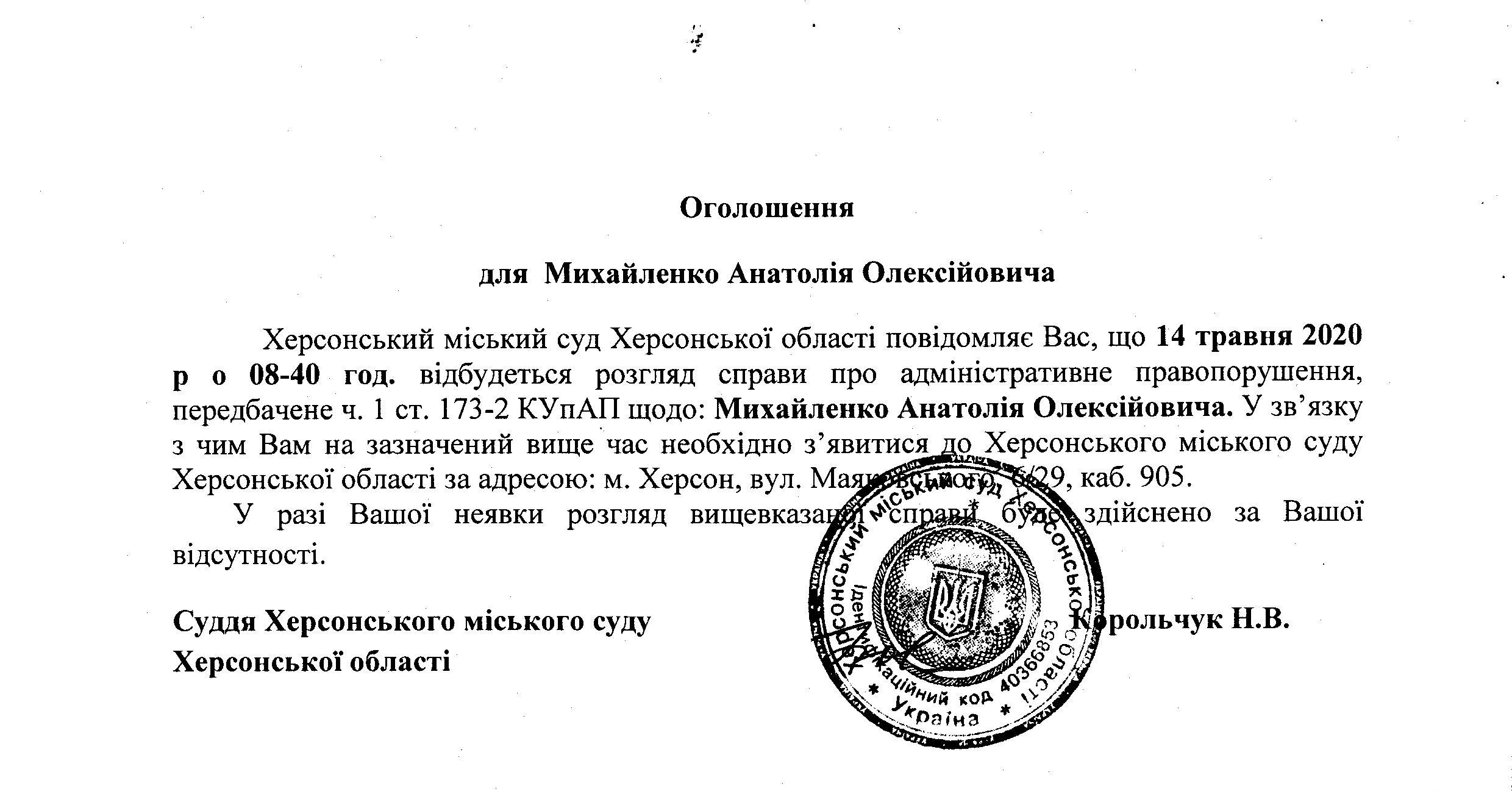 ОГОЛОШЕННЯ для Михайленко Анатолія Олексійовича
