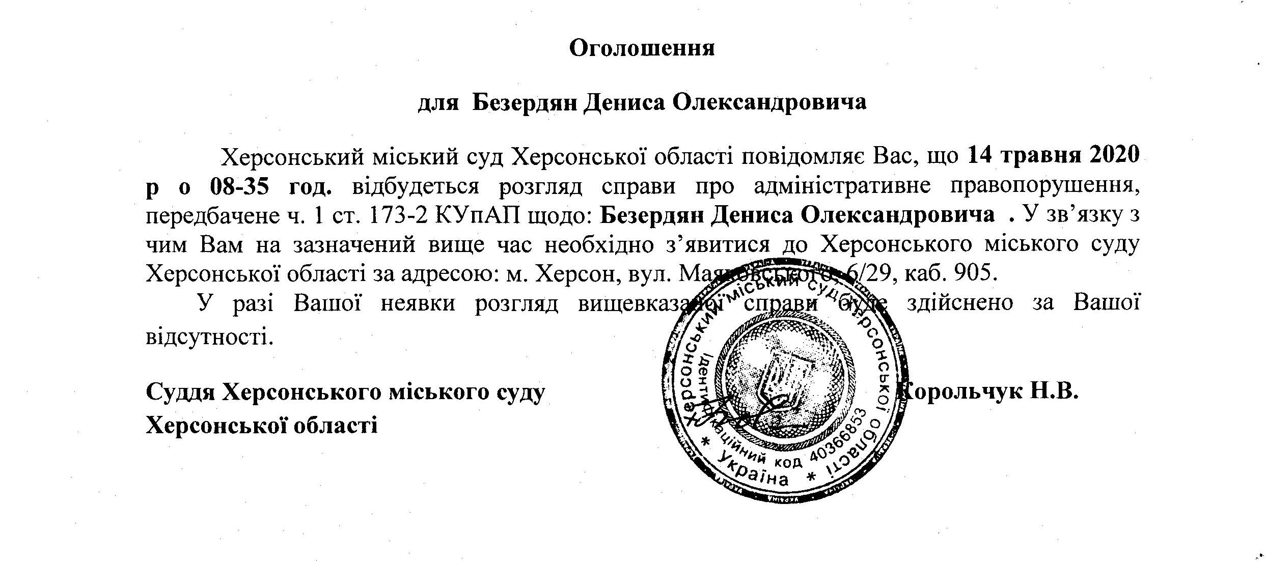 ОГОЛОШЕННЯ для Безердян Дениса Олександровича