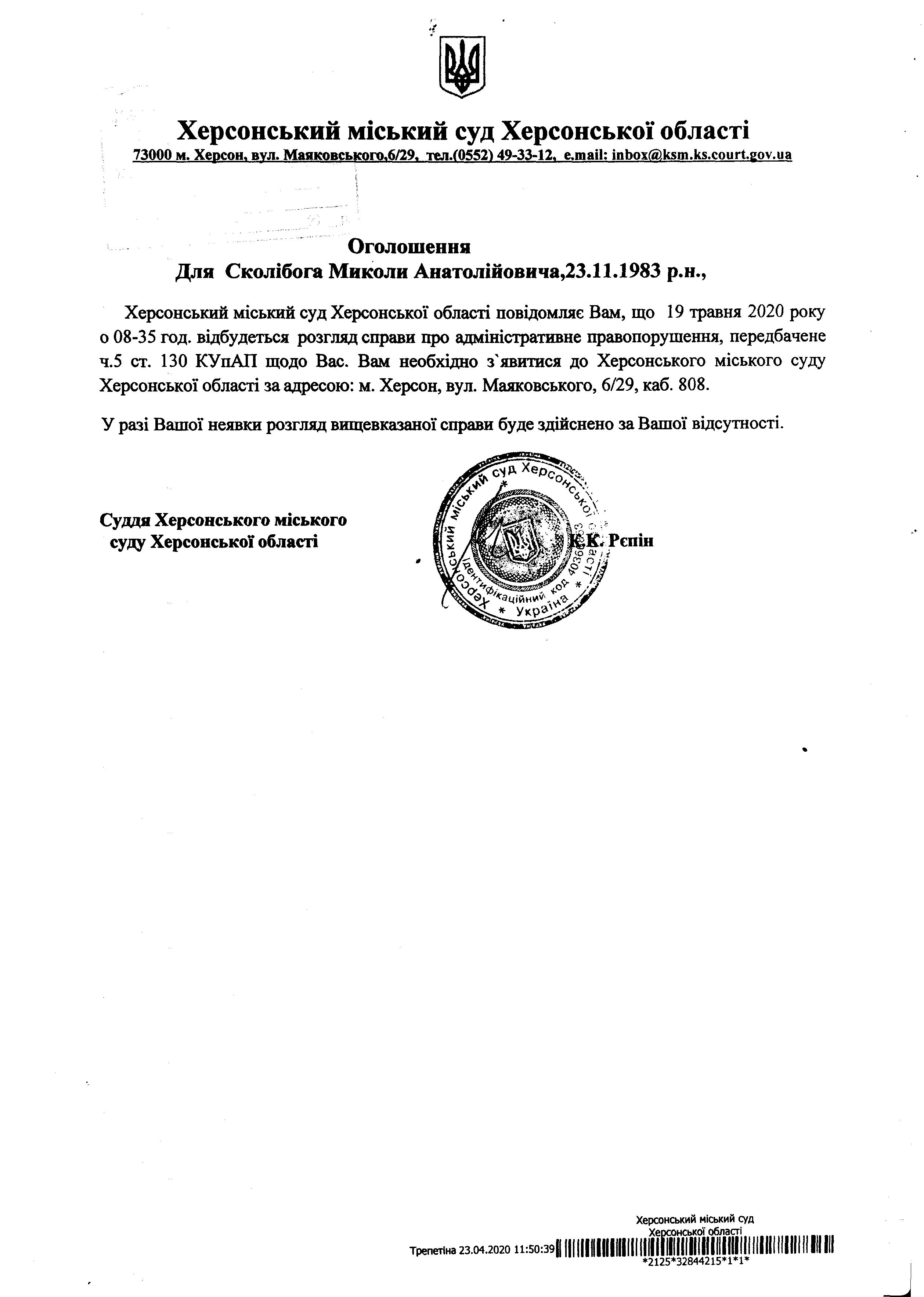 ОГОЛОШЕННЯ для Сколібога Миколи Анатолійовича
