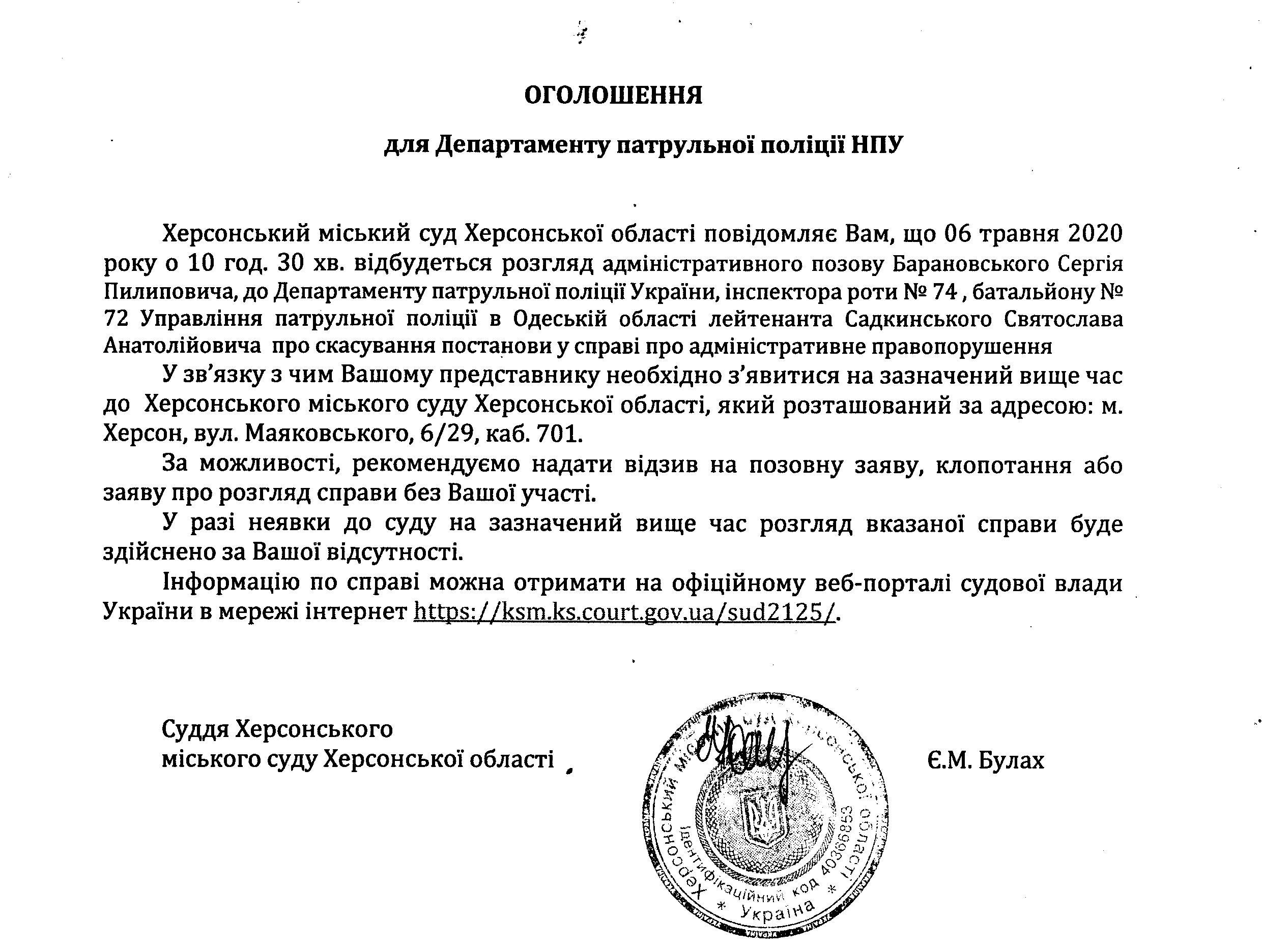 ОГОЛОШЕННЯ ПРО ВИКЛИК ДО СУДУ
