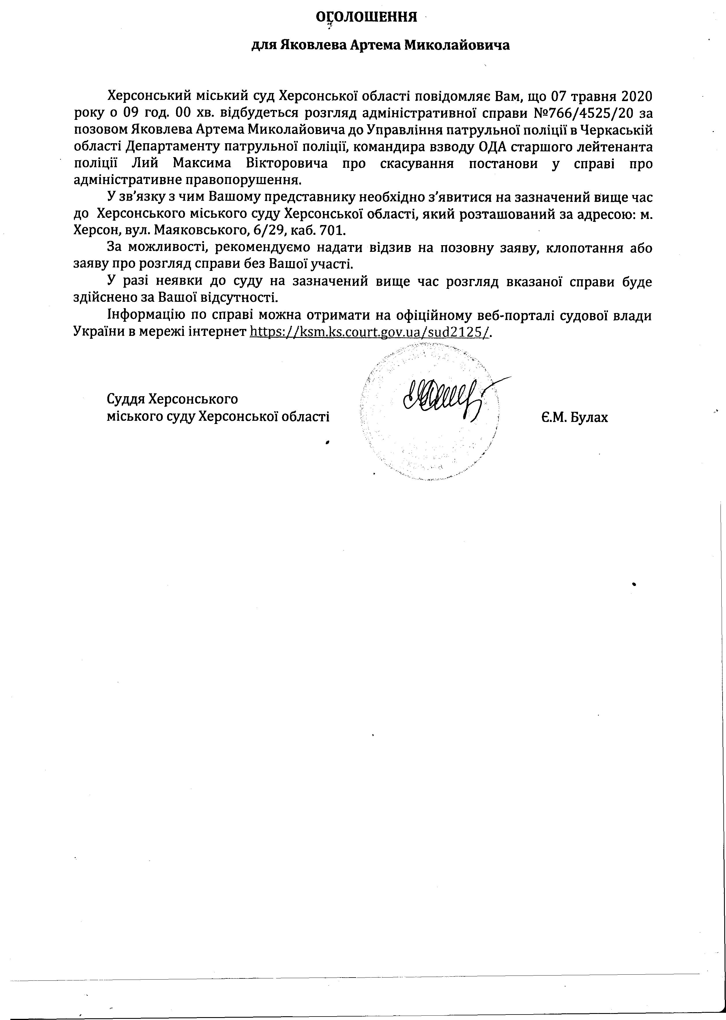 ОГОЛОШЕННЯ для Яковлева Артема Миколайовича