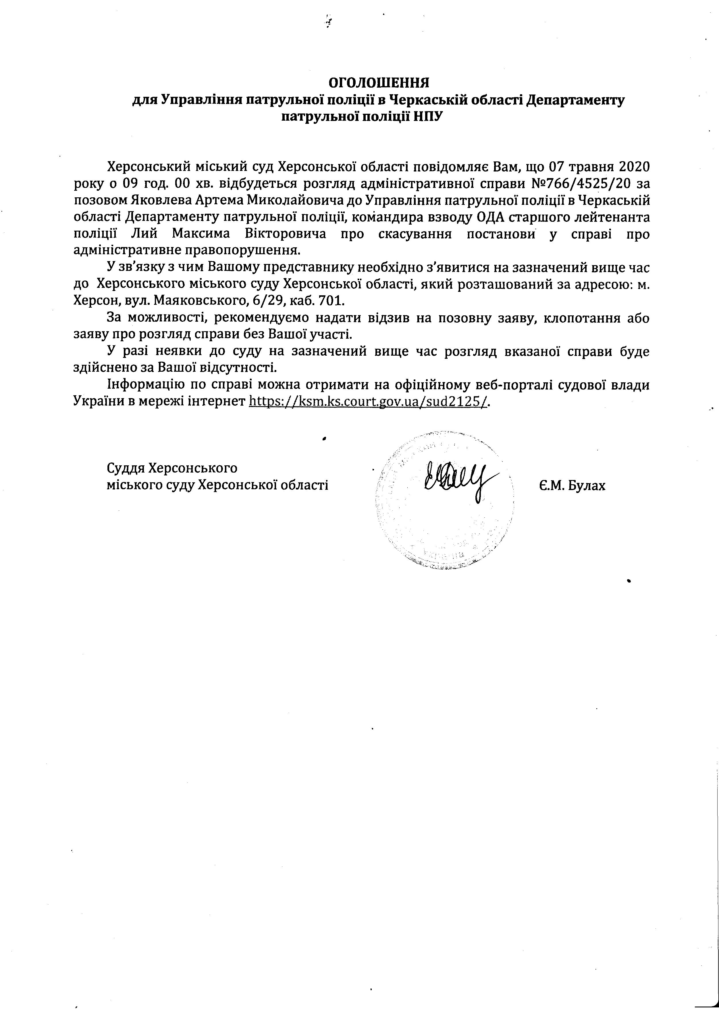 ОГОЛОШЕННЯ ПРО ВИКЛИК ДО СУДУ