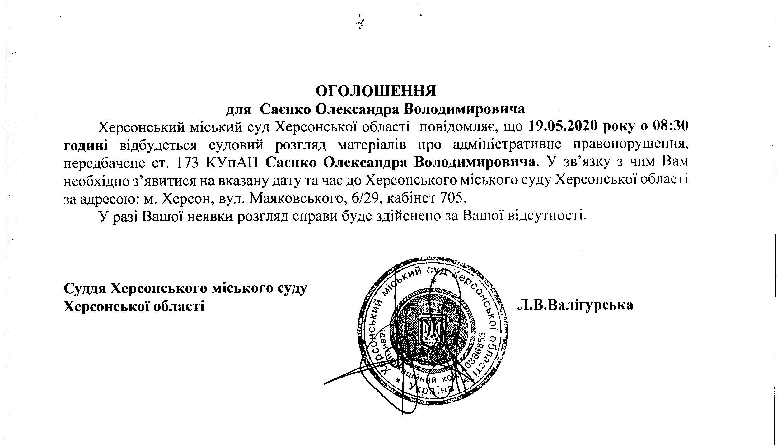 ОГОЛОШЕННЯ для Саєнко Олександра Володимировича