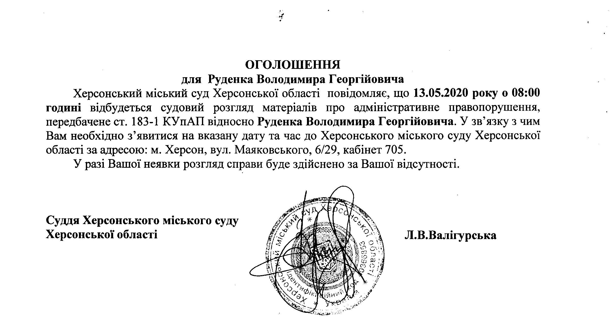 ОГОЛОШЕННЯ для Руденка Володимира Георгійовича