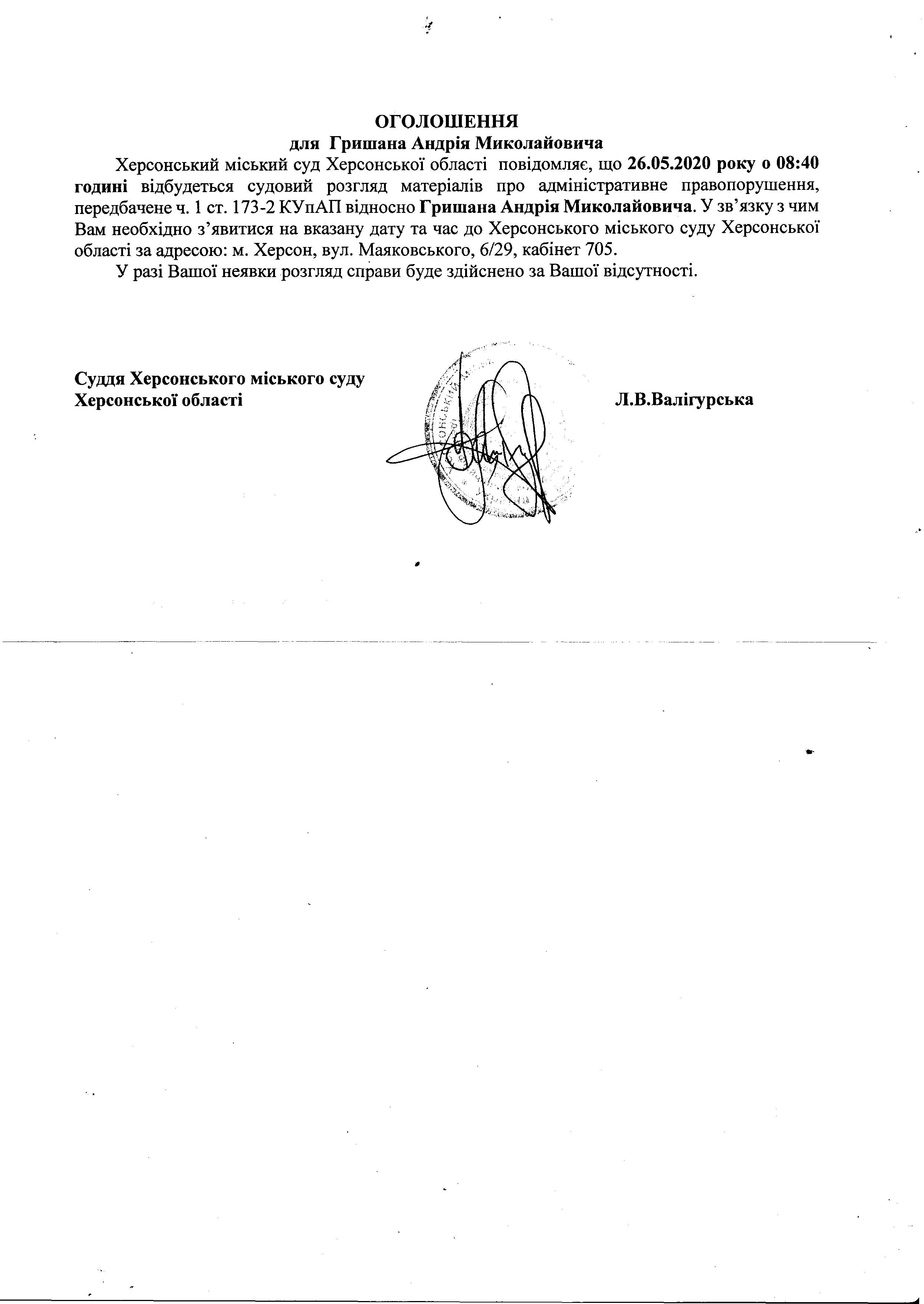ОГОЛОШЕННЯ для Гришана Андрія Миколайовича