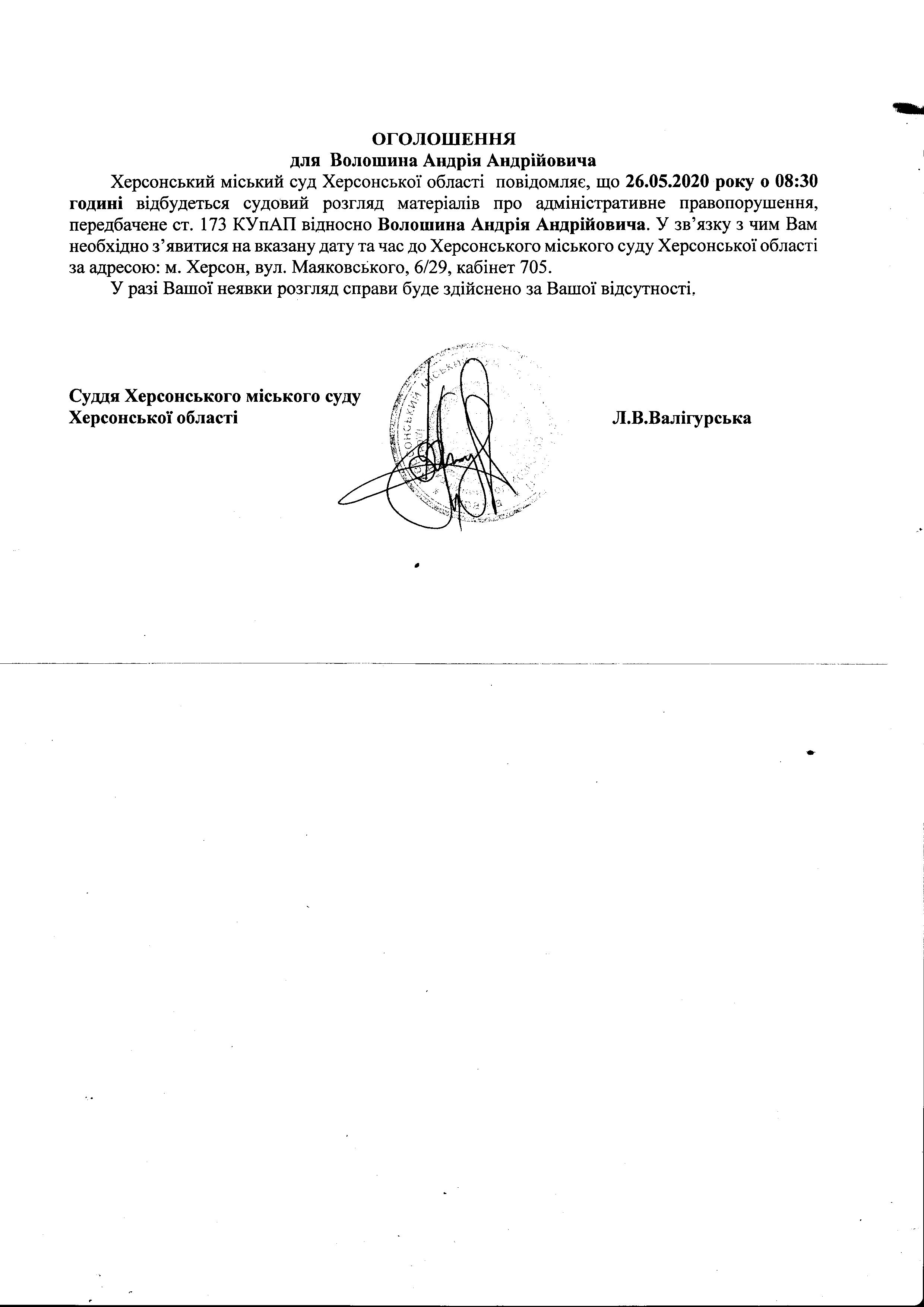 ОГОЛОШЕННЯ для Волошина Андрія Андрійовича
