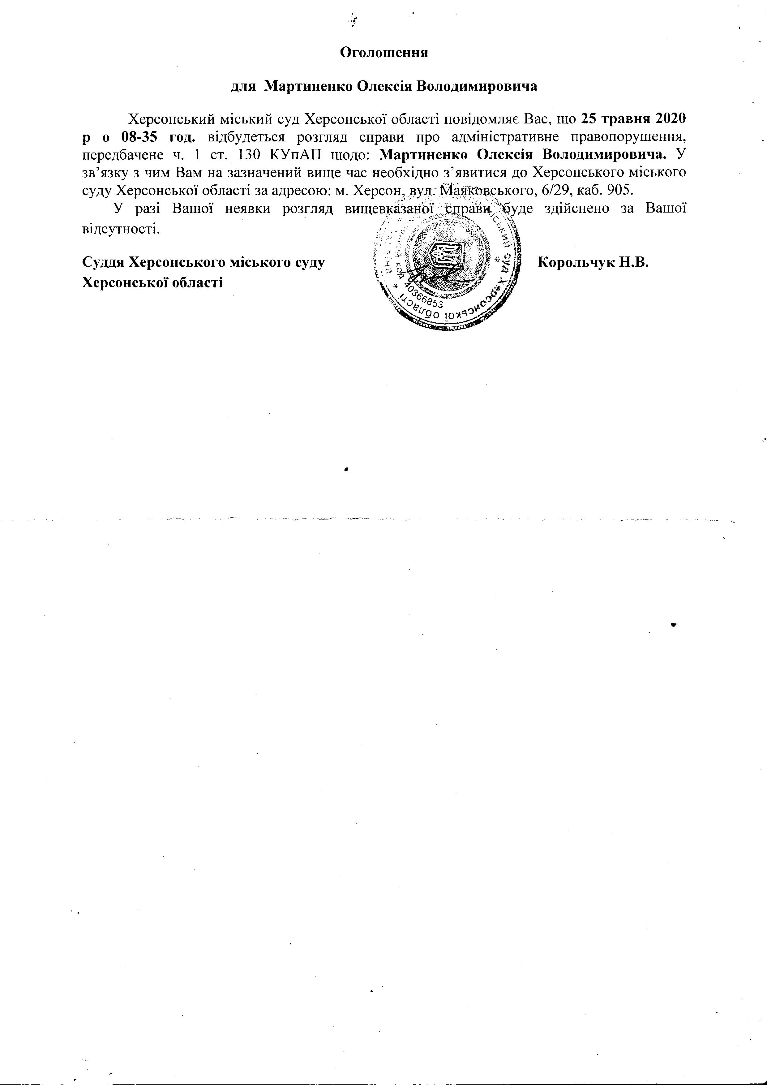 ОГОЛОШЕННЯ для Мартиненко Олексія Володимировича