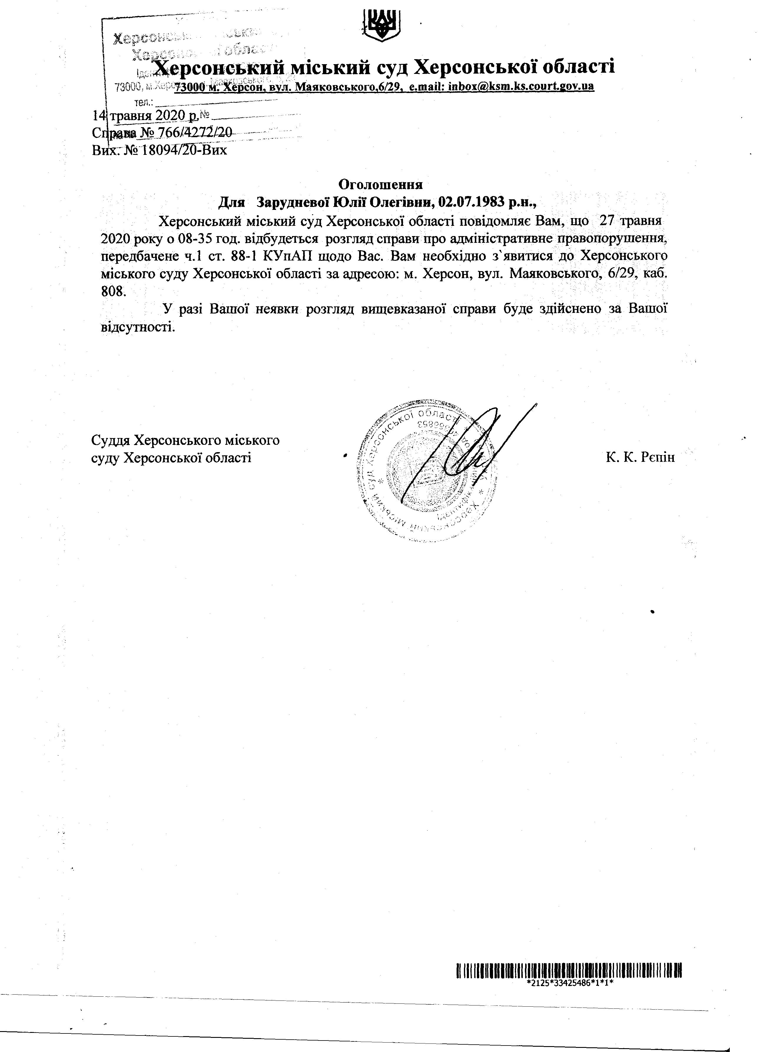 ОГОЛОШЕННЯ для Зарудневої Юлії Олегівни