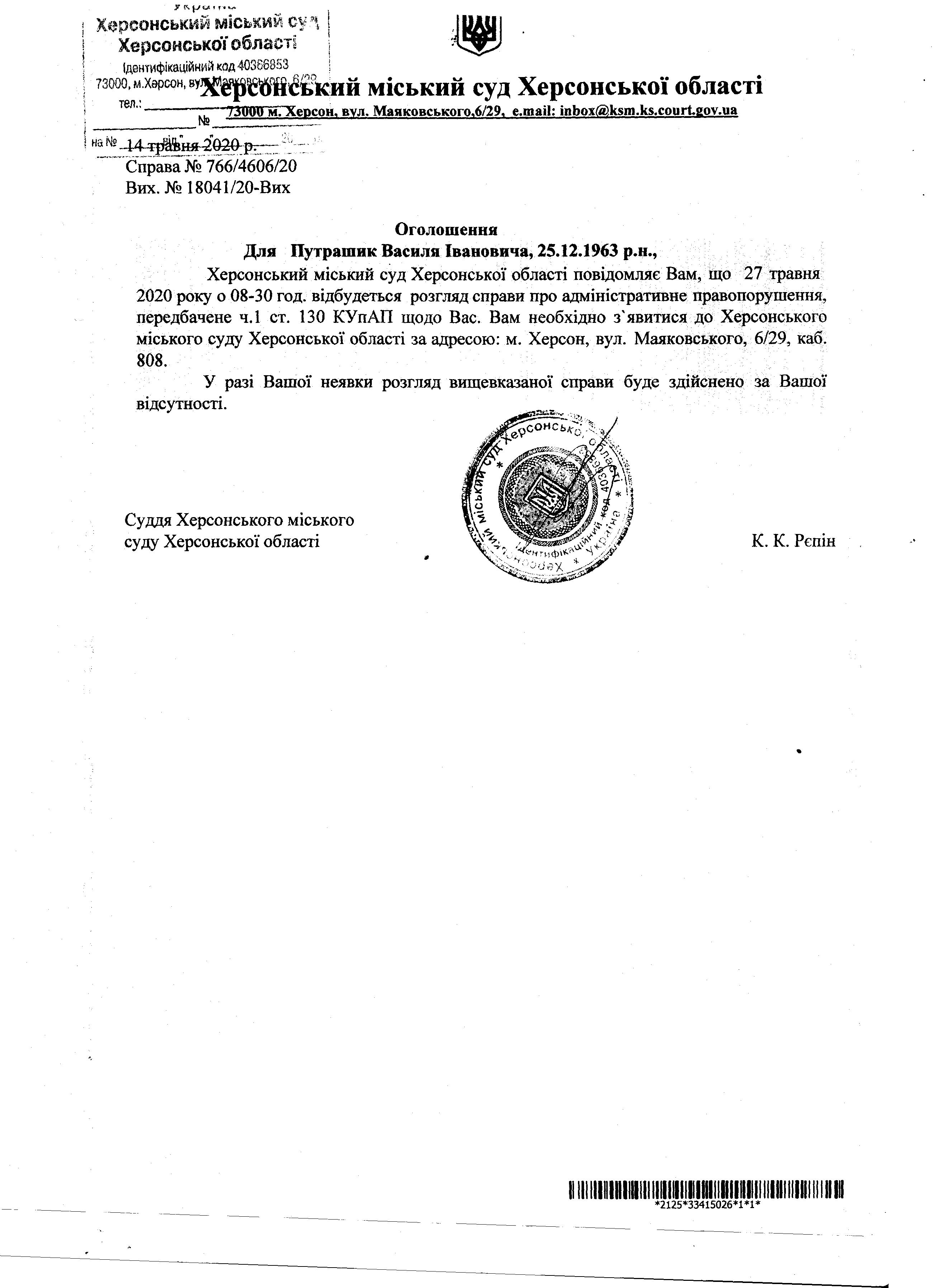 ОГОЛОШЕННЯ для Путрашик Василя Івановича