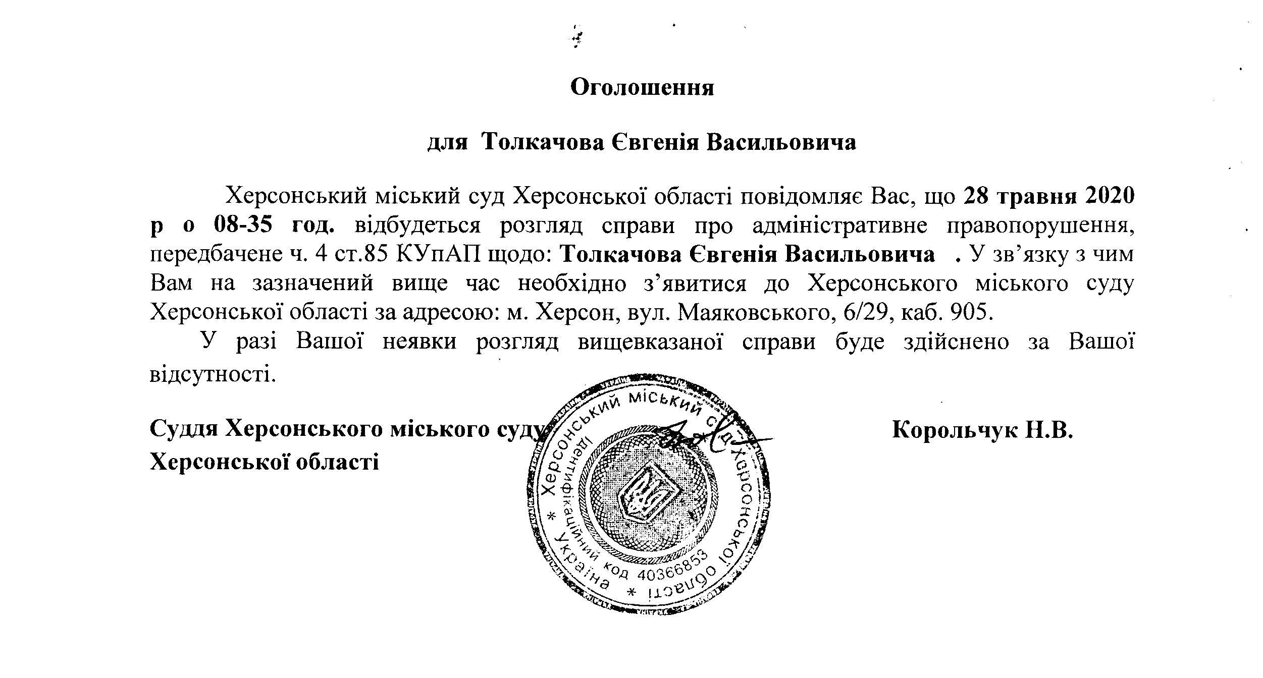 ОГОЛОШЕННЯ для Толкачова Євгенія Васильовича
