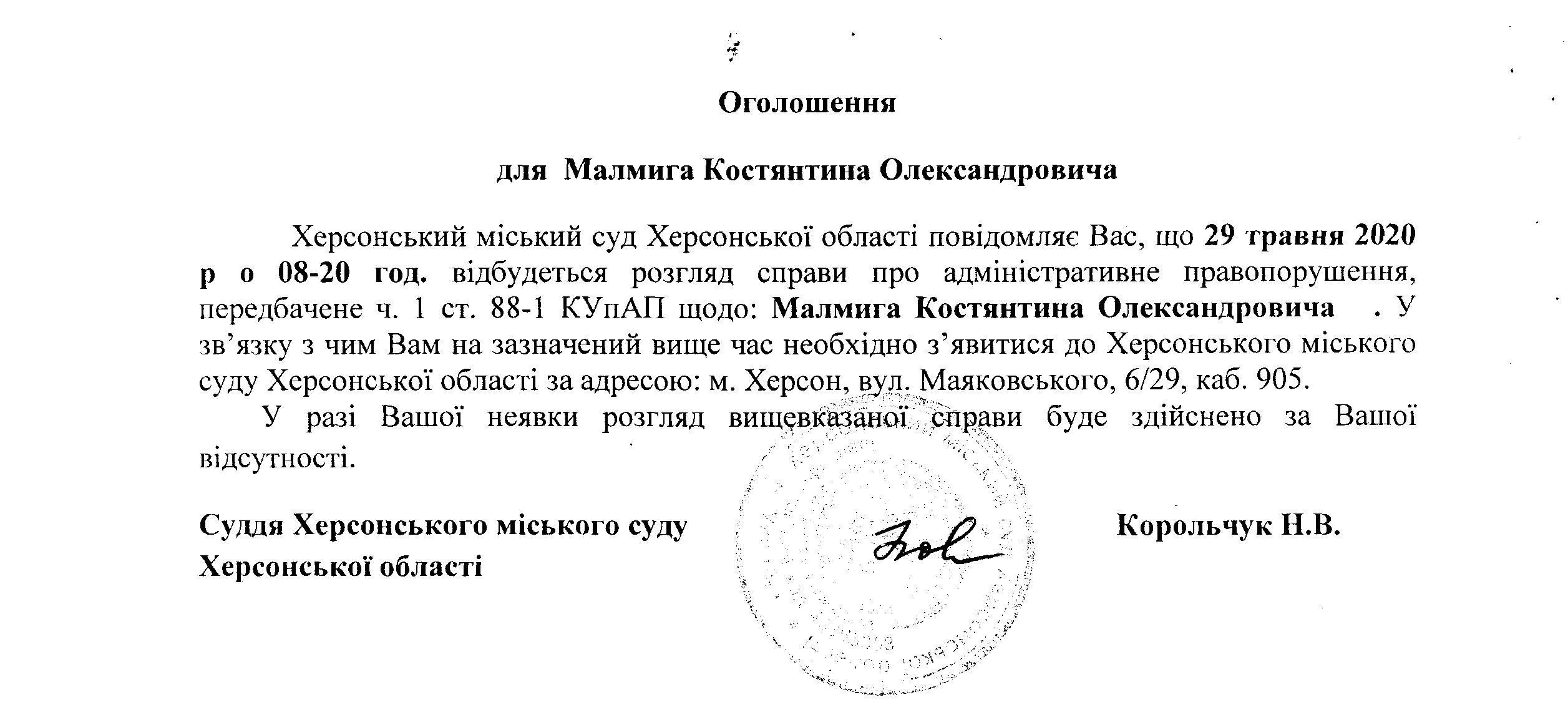 ОГОЛОШЕННЯ для Малмига Костянтина Олександровича