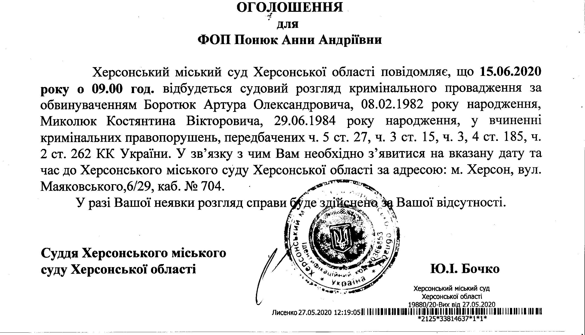 ОГОЛОШЕННЯ ПРО ВИКЛИК ДО СУДУ