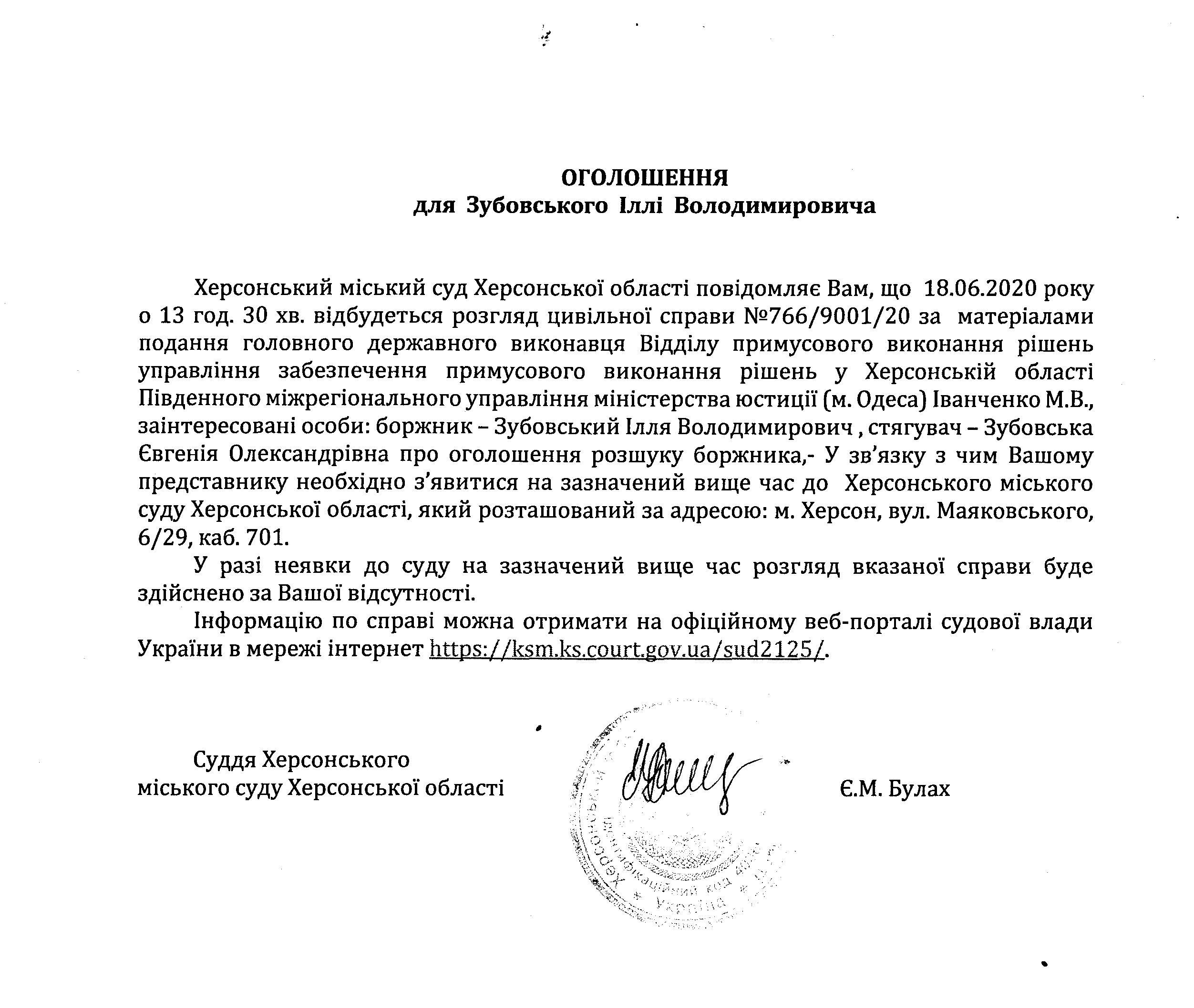 ОГОЛОШЕННЯ для Зубовського Іллі Володимировича