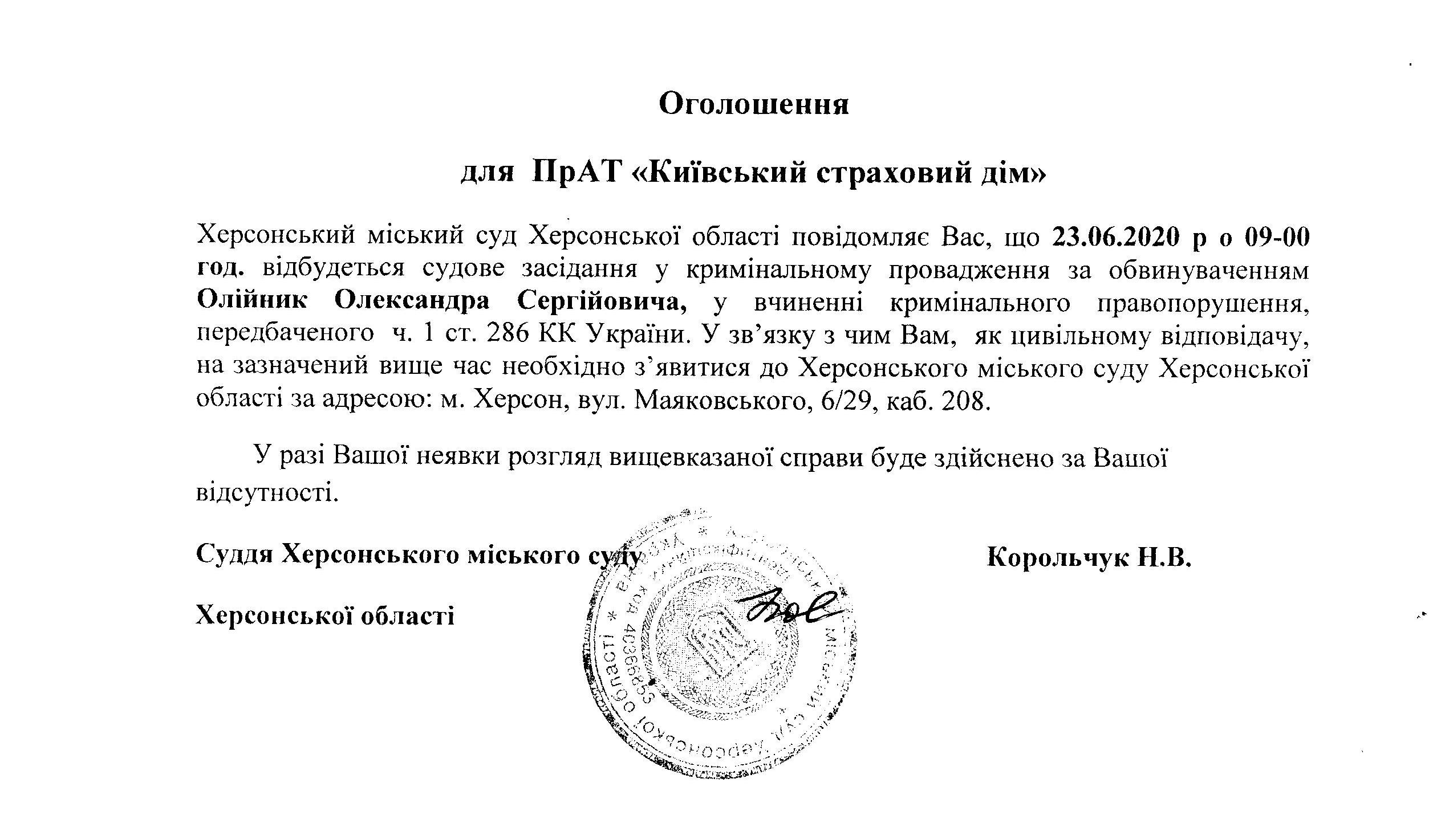 ОГОЛОШЕННЯ ПРО ВИКЛИК ДО СУДУ