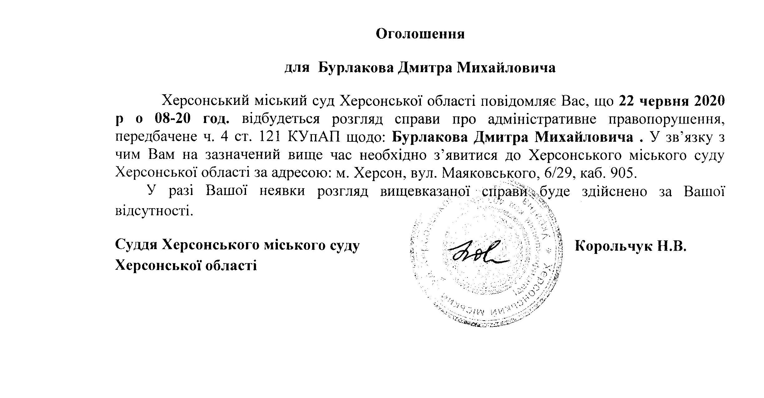 ОГОЛОШЕННЯ для Бурлакова Дмитра Михайловича