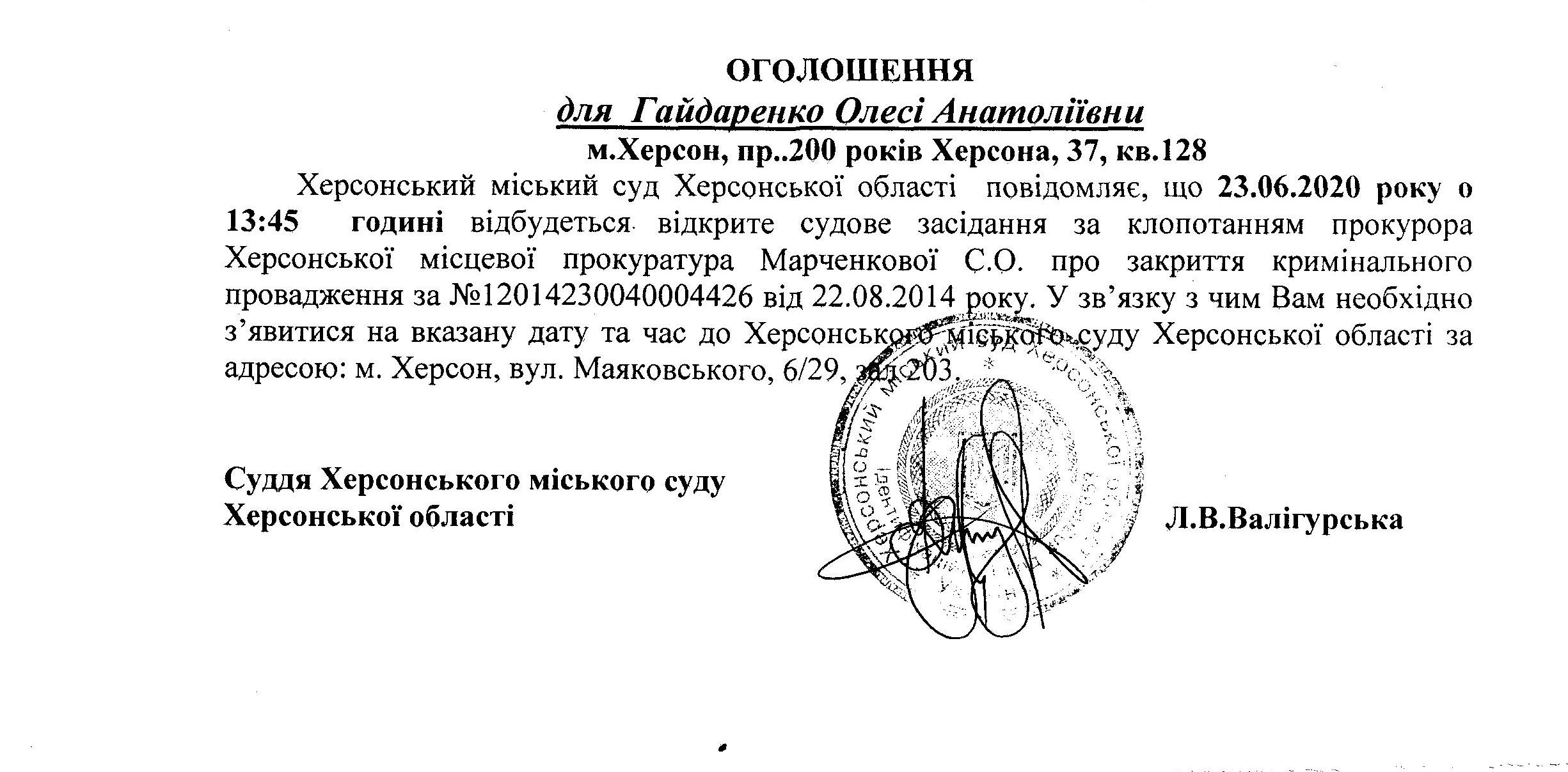 ОГОЛОШЕННЯ для Гайдаренко Олесі Анатоліївни