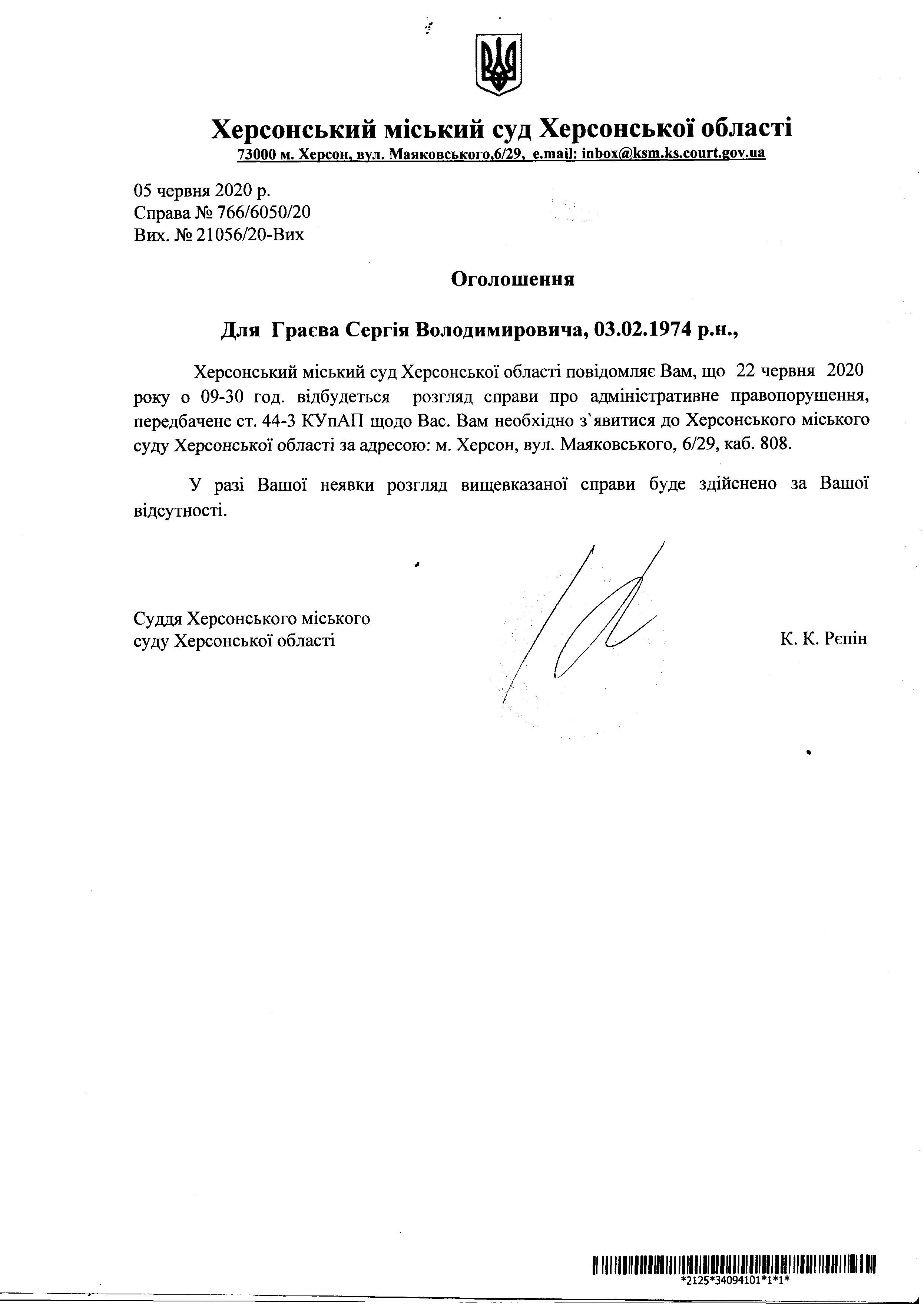 ОГОЛОШЕННЯ для Граєва Сергія Володимировича