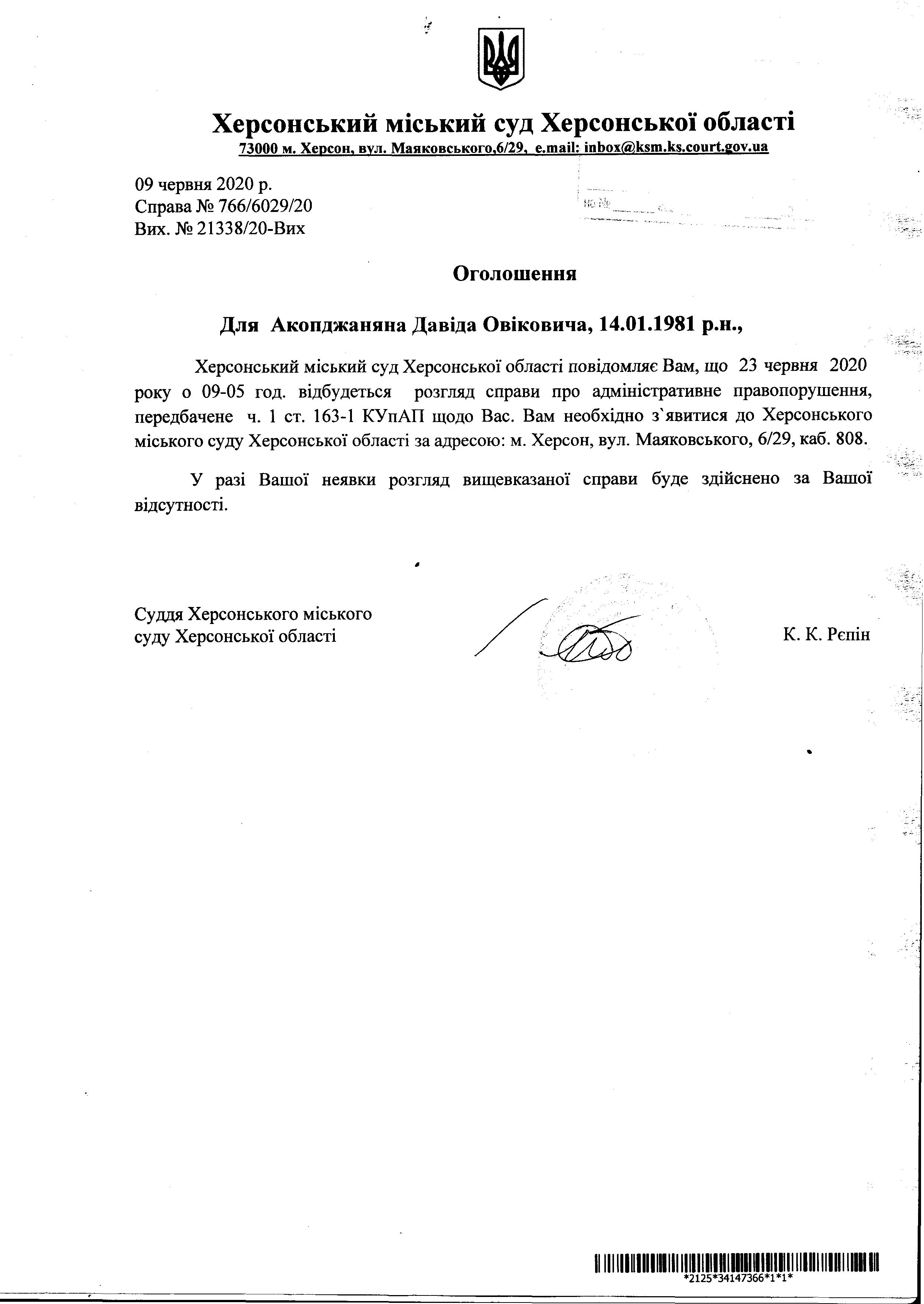 ОГОЛОШЕННЯ для Акопджаняна Давіда Овіковича