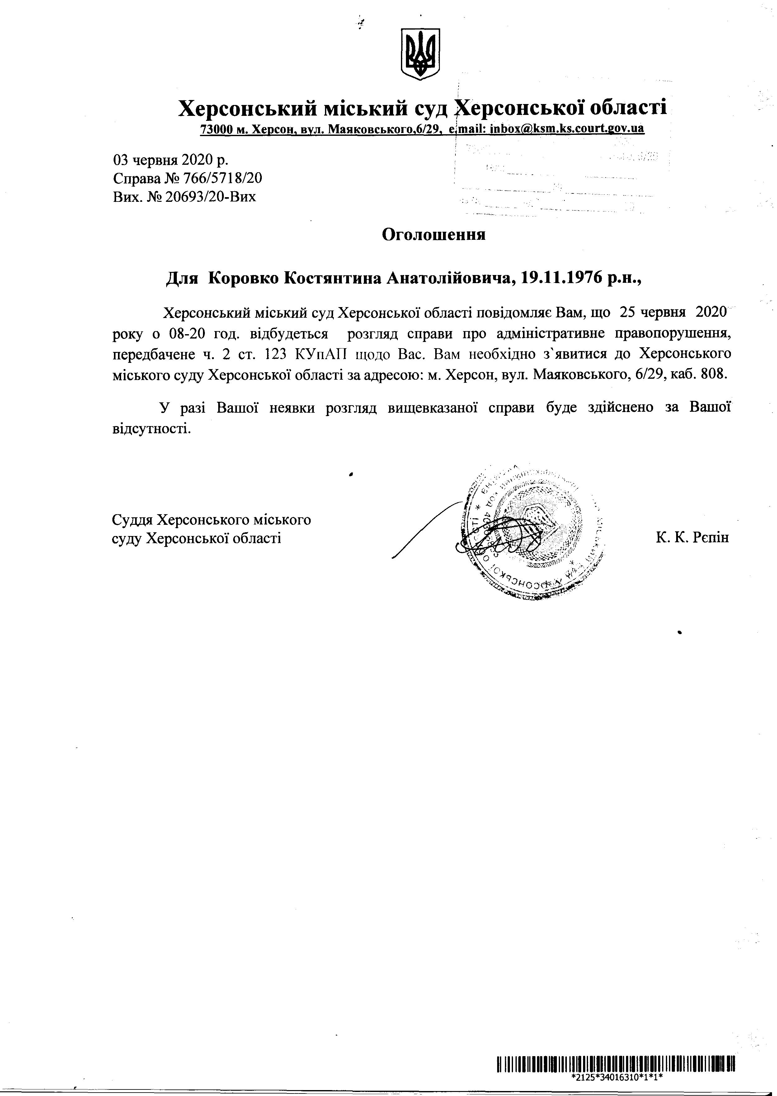 ОГОЛОШЕННЯ ПРО ВИКЛИК ДО СУДУ