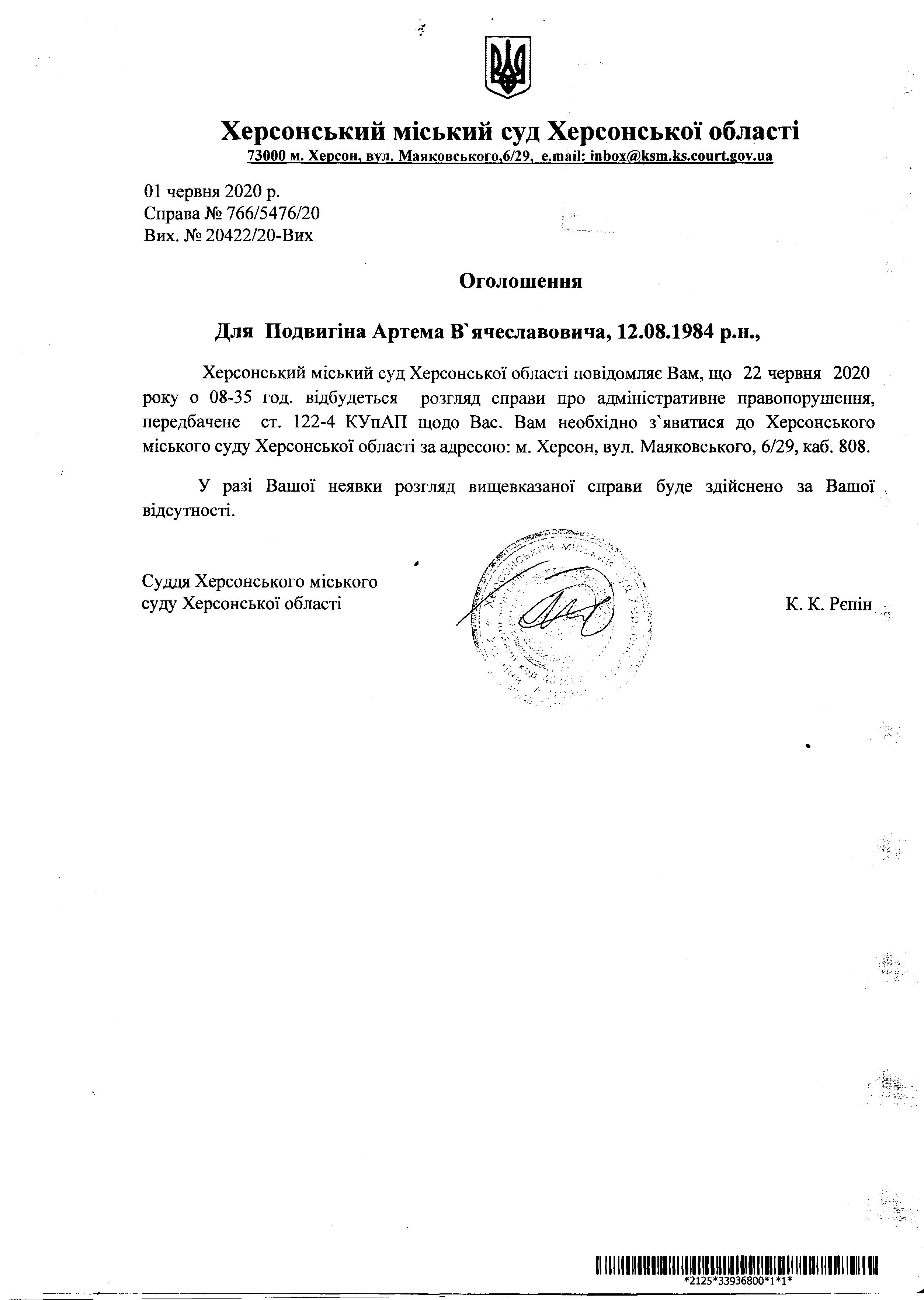 ОГОЛОШЕННЯ для Подвигіна Артема В'ячеславовича