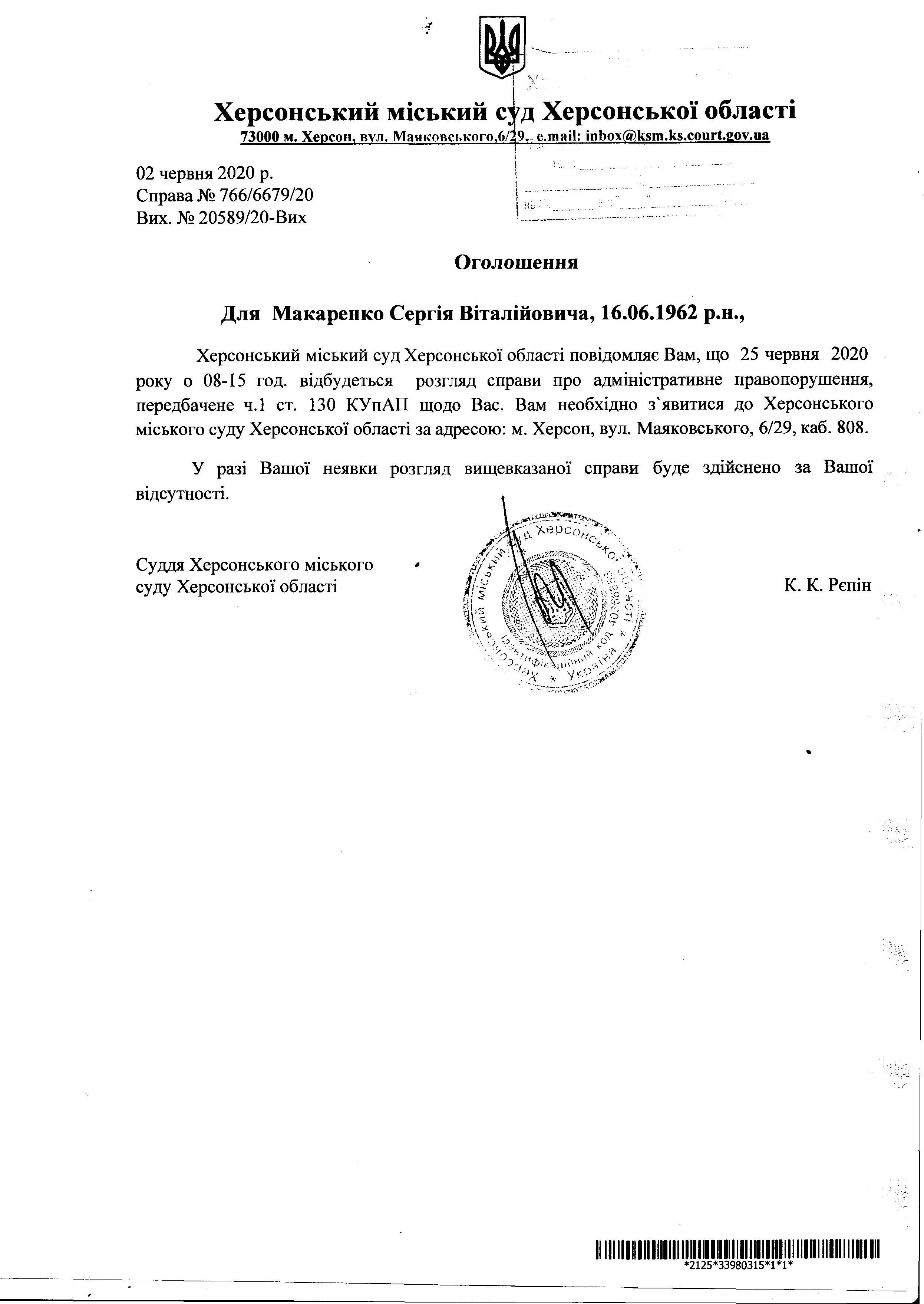 ОГОЛОШЕННЯ ПРО ВИКЛИК ДО СУДУ