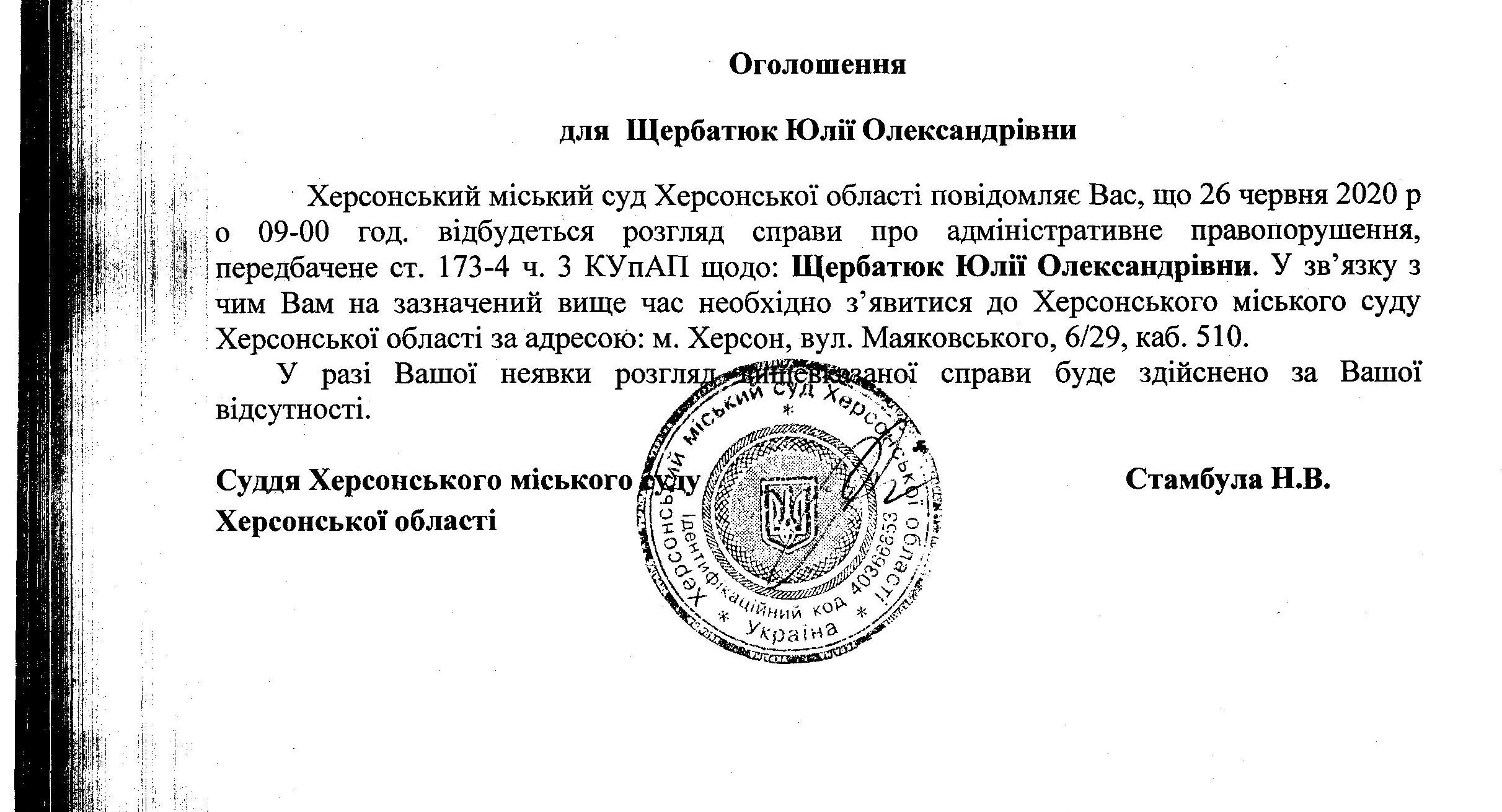 ОГОЛОШЕННЯ для Щербатюк Юлії Олександрівни