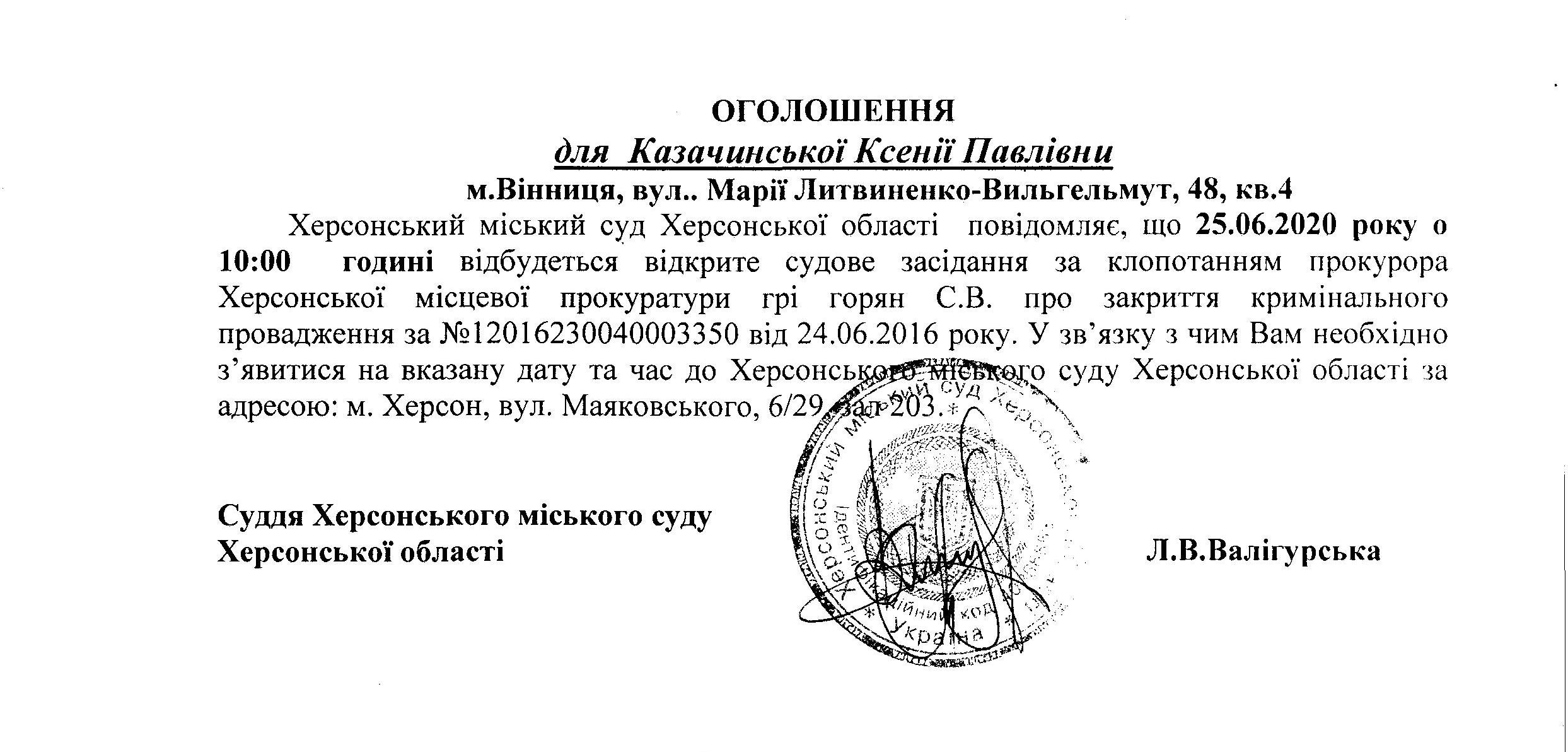 ОГОЛОШЕННЯ для Казачинської Ксенії Павлівни