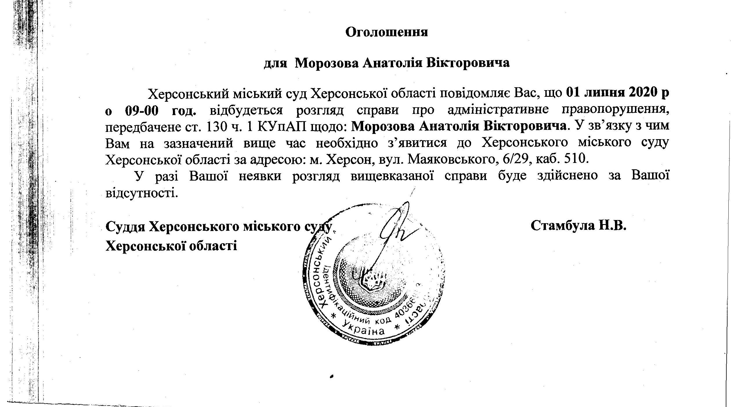 ОГОЛОШЕННЯ для Морозова Анатолія Вікторовича