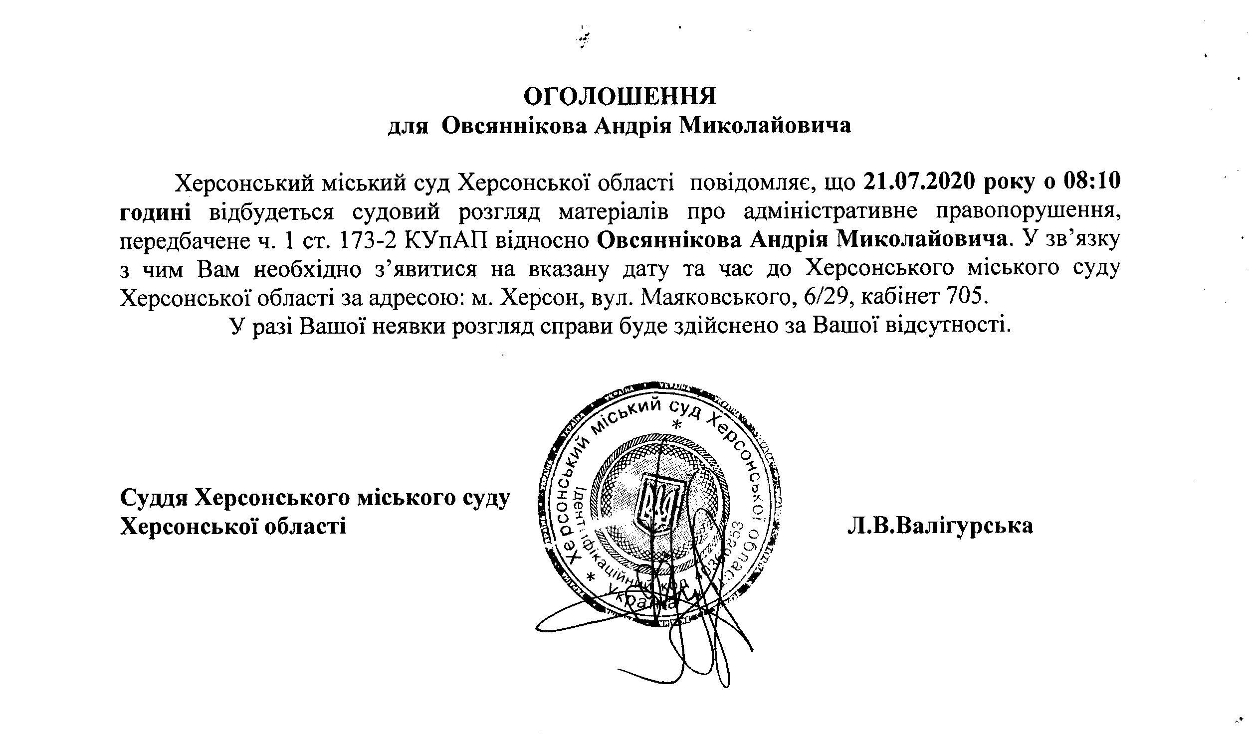 ОГОЛОШЕННЯ для Овсяннікова Андрія Миколайовича