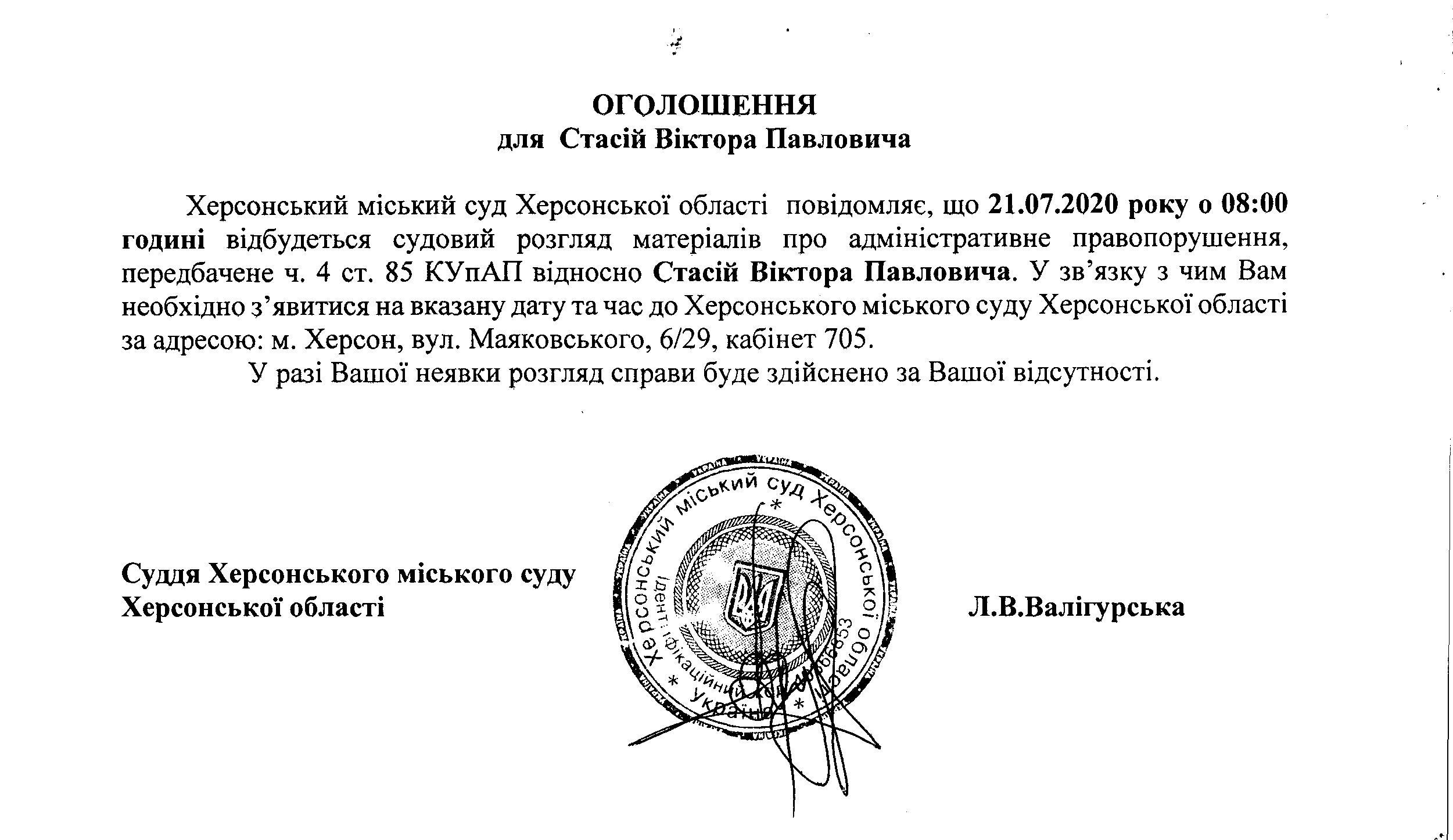 ОГОЛОШЕННЯ для Стасія Віктора Павловича