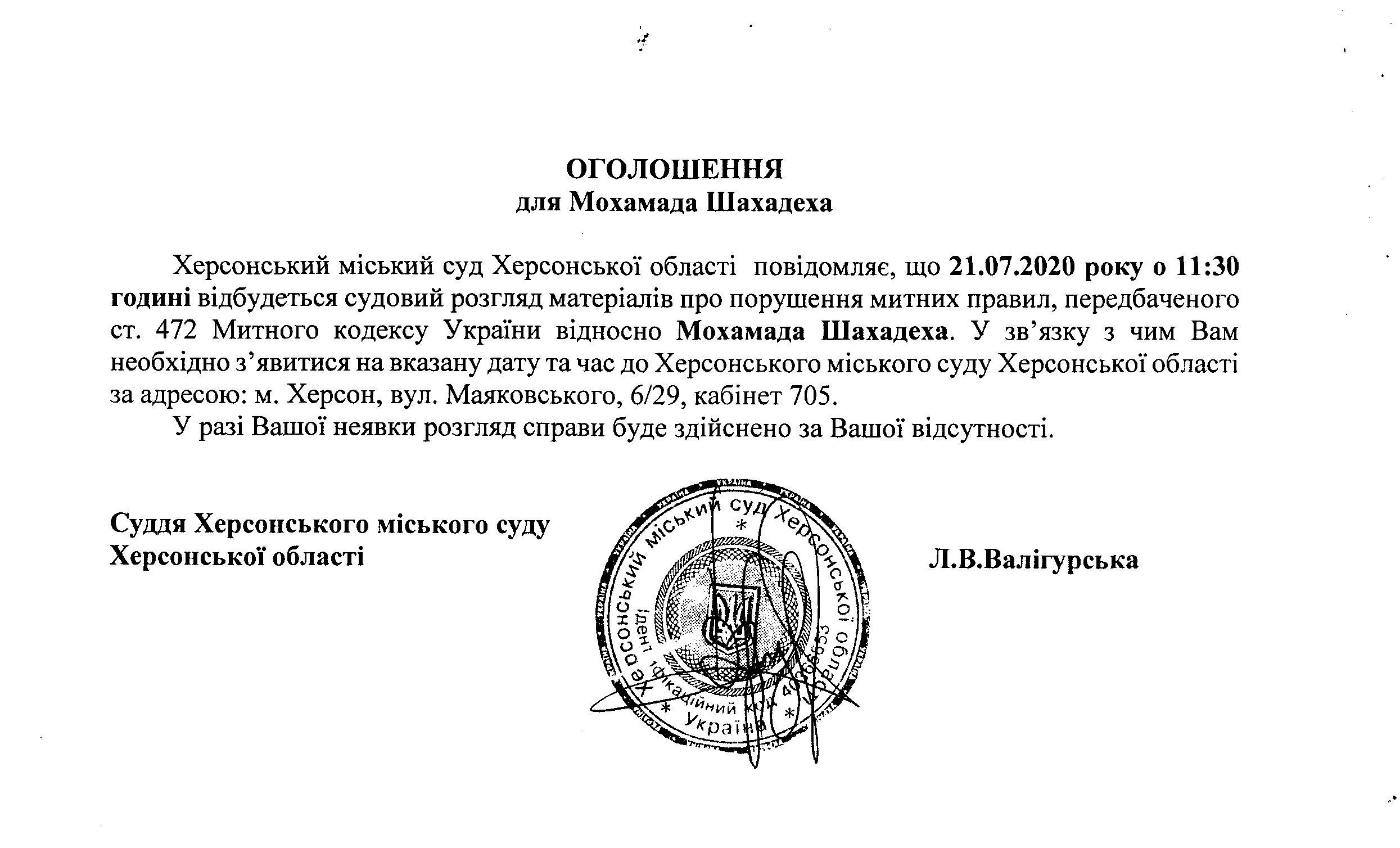 ОГОЛОШЕННЯ для Мохамада Шахадеха
