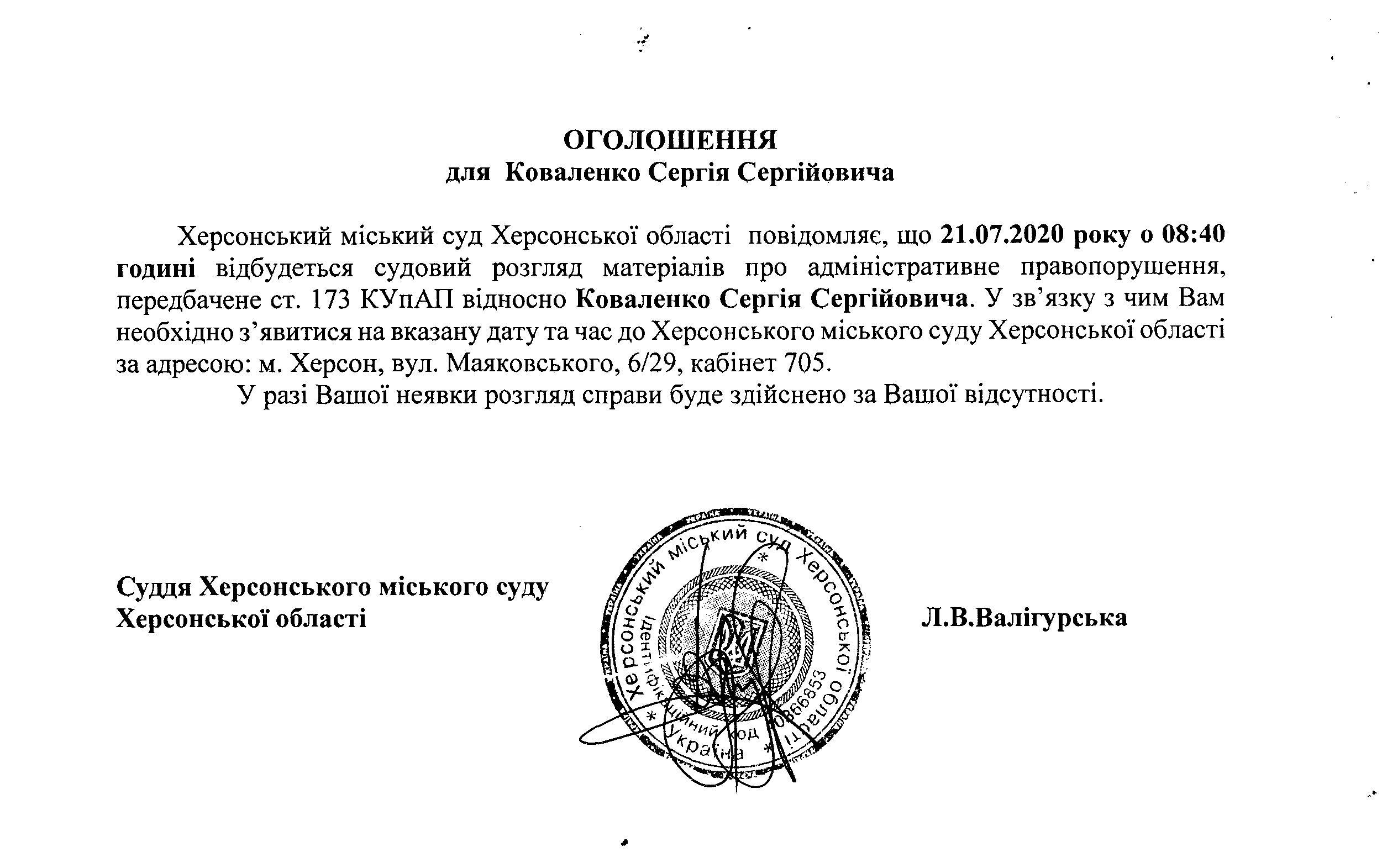 ОГОЛОШЕННЯ для Коваленко Сергія Сергійовича