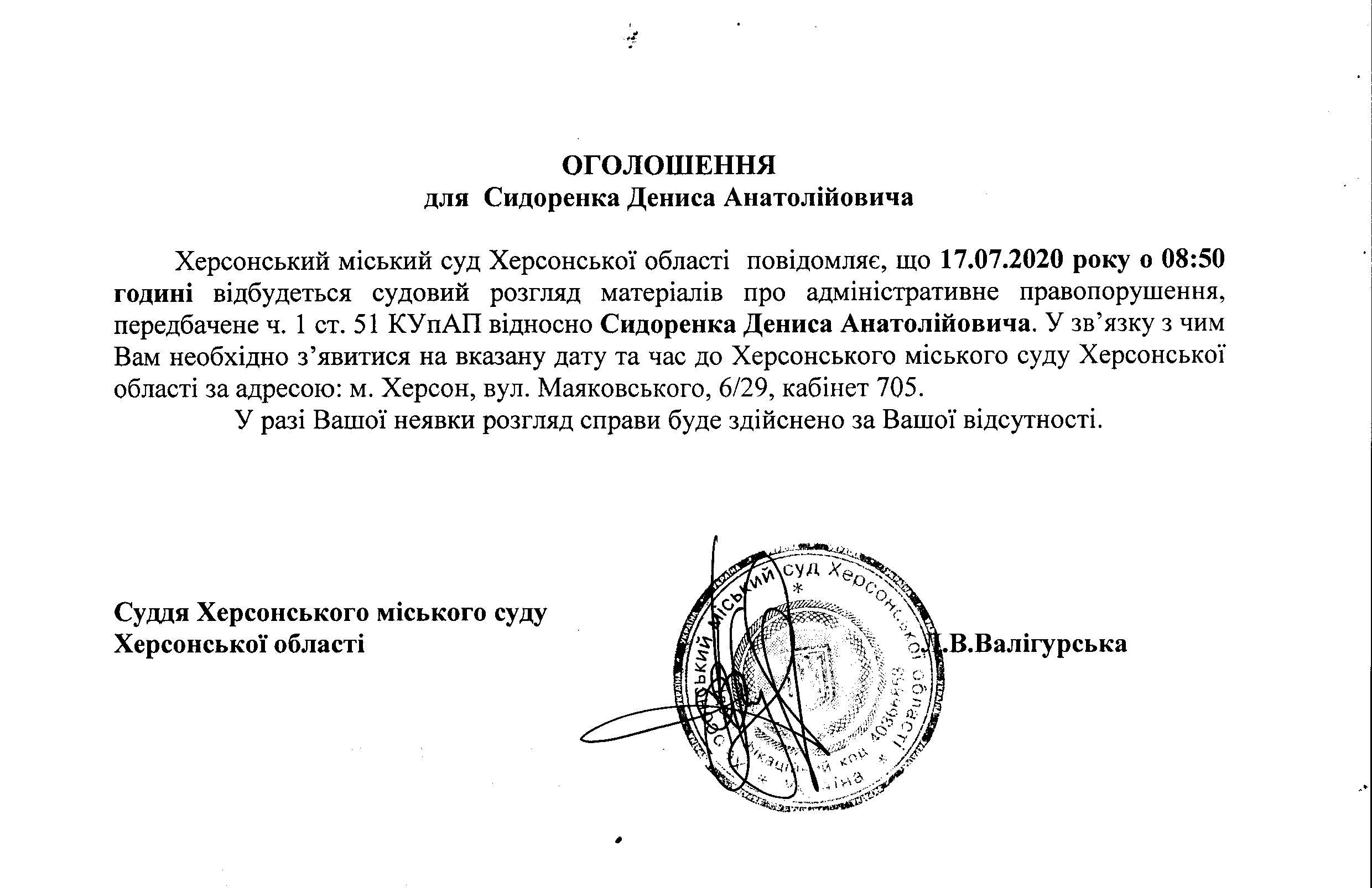 ОГОЛОШЕННЯ для Сидоренко Дениса Анатолійовича